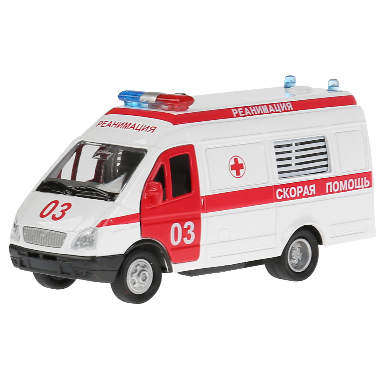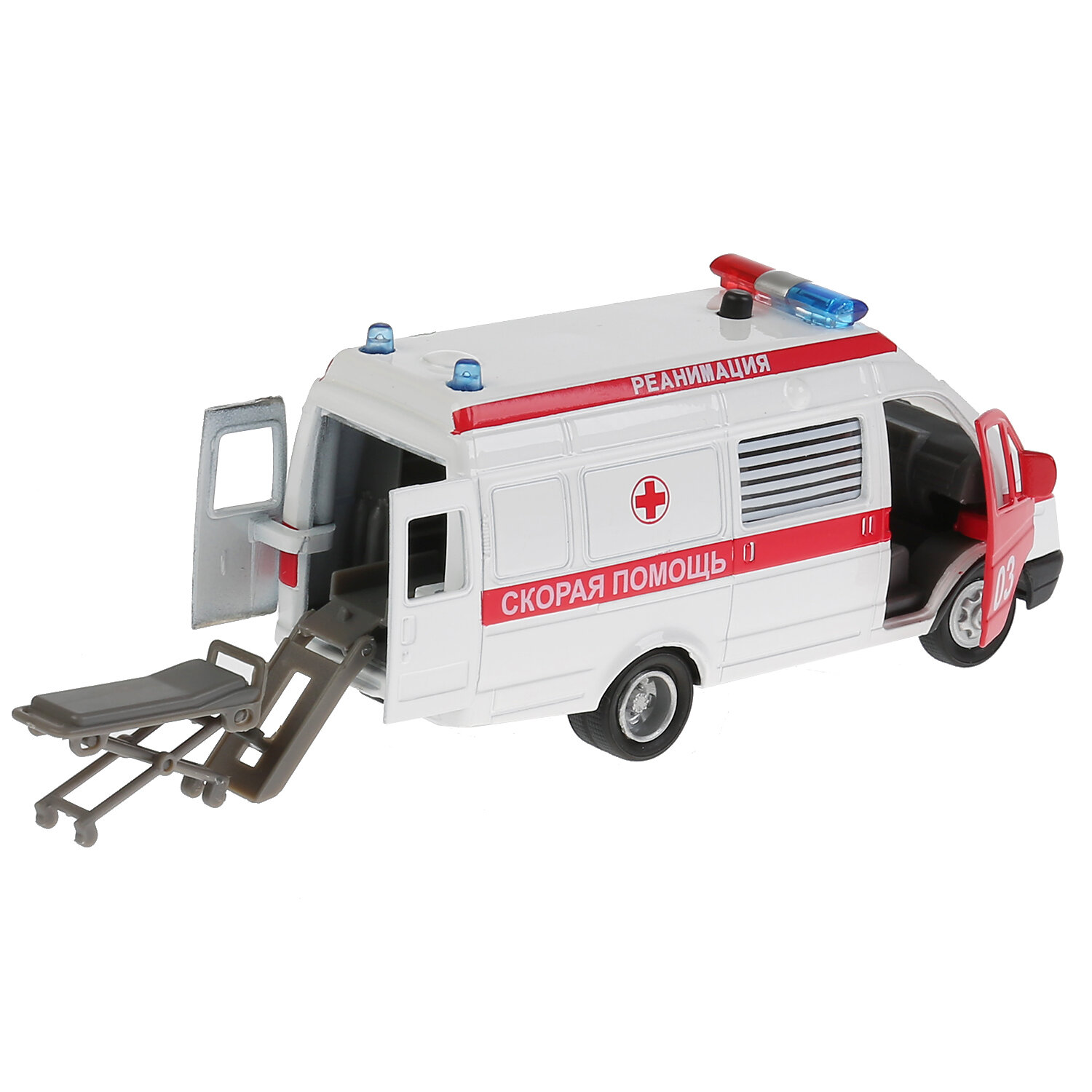 | Комплектация | • Размеры машинки: 15.5х6.5х6 см. • Открываются передние и задние двери. • Световые и звуковые эффекты. • Носилки в комплекте. • Материал: пластик,металл,резина |