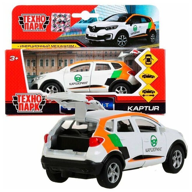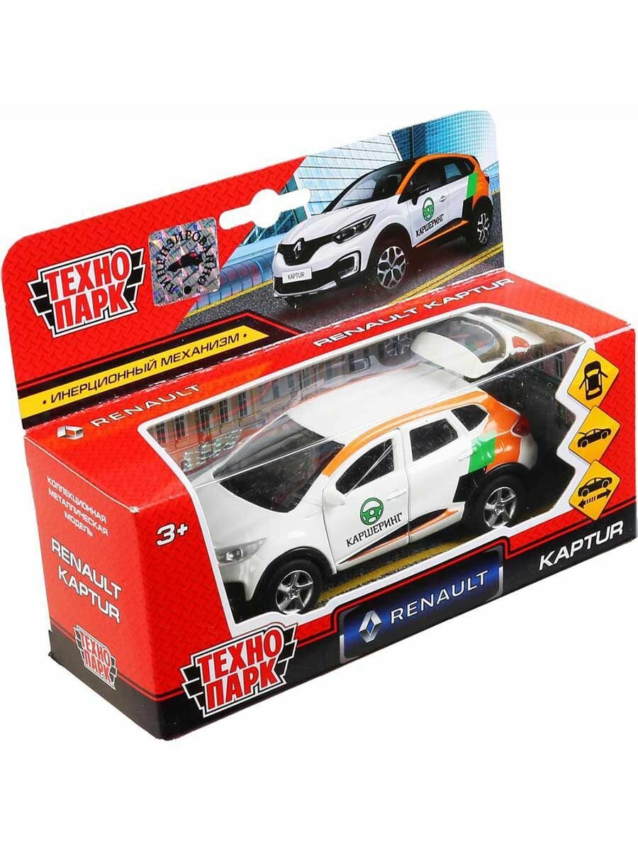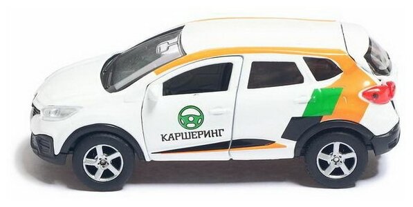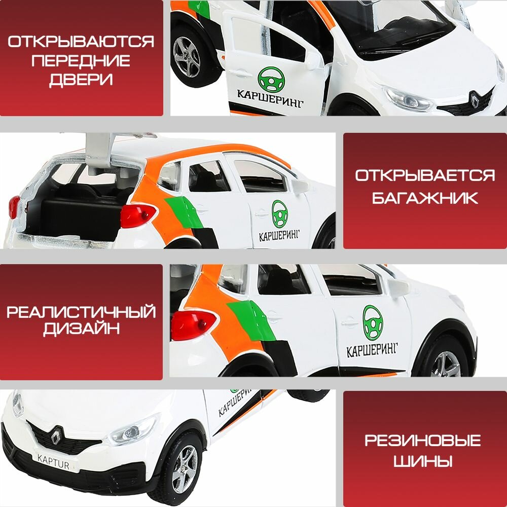 Машинка детская Renault Kaptur Каршеринг 12 см, Технопарк, белая, открываются двери и багажник, металлический корпус