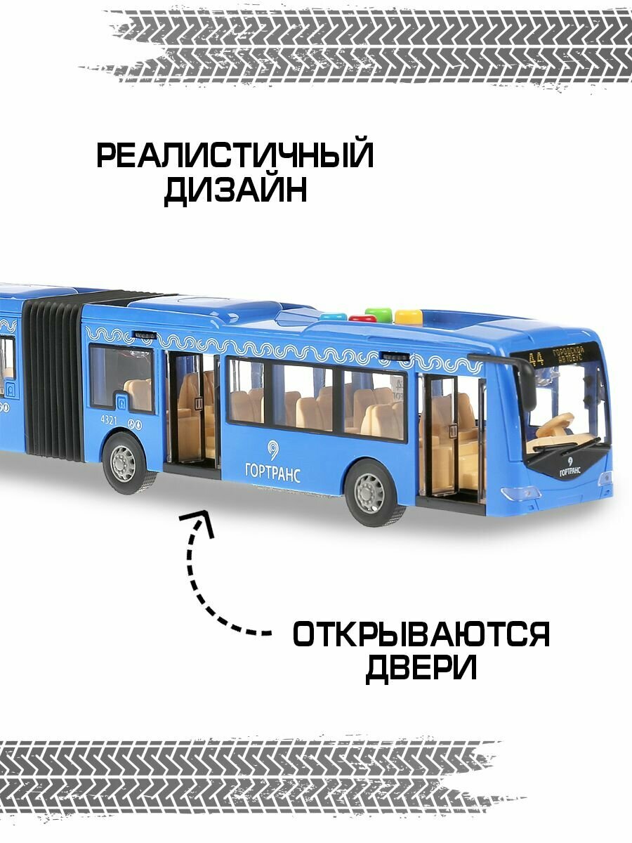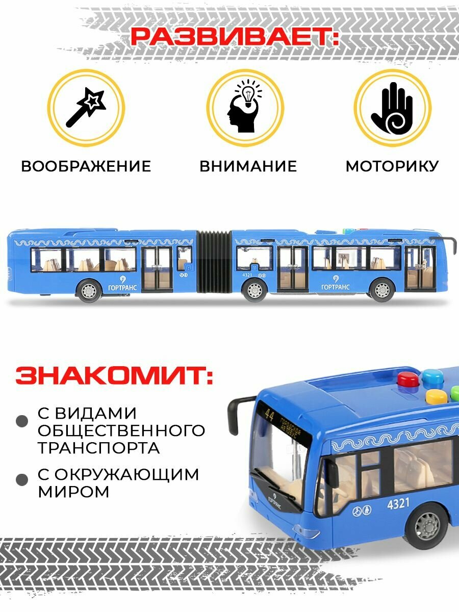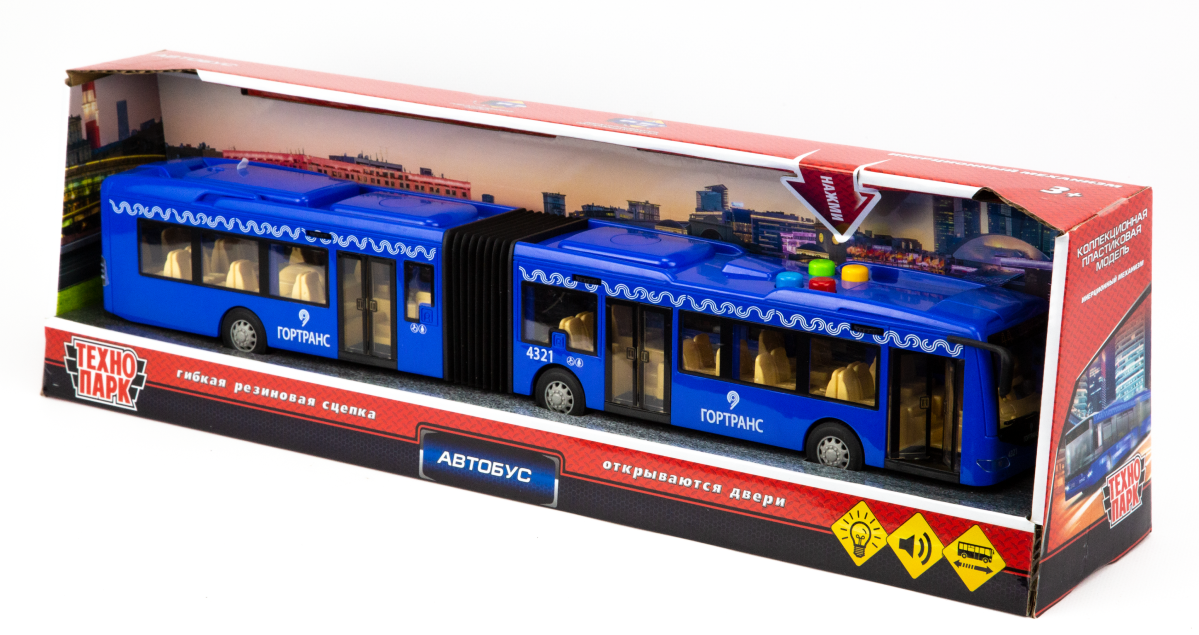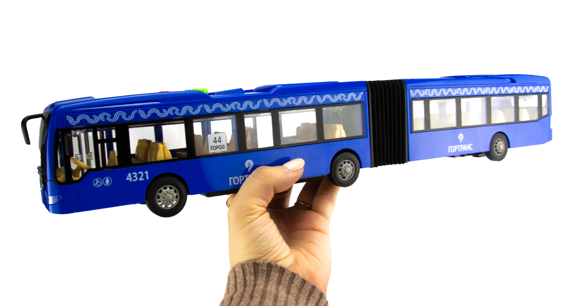 Автобус Технопарк сочлененный, синий, пластиковый, инерционный, свет, звук ВUS-45РL-ВU