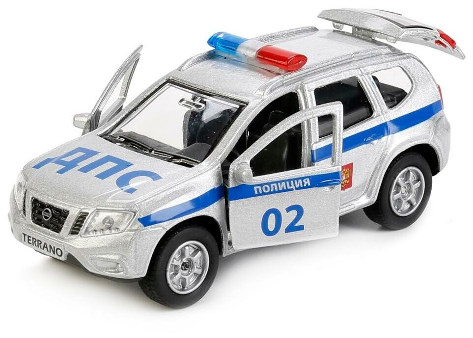 Машинка детская Nissan Terrano Полиция 12 см, Технопарк, серебристая, металлический корпус, открываются двери и багажник