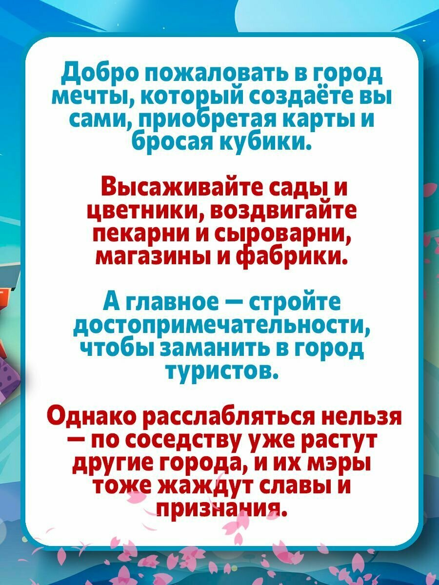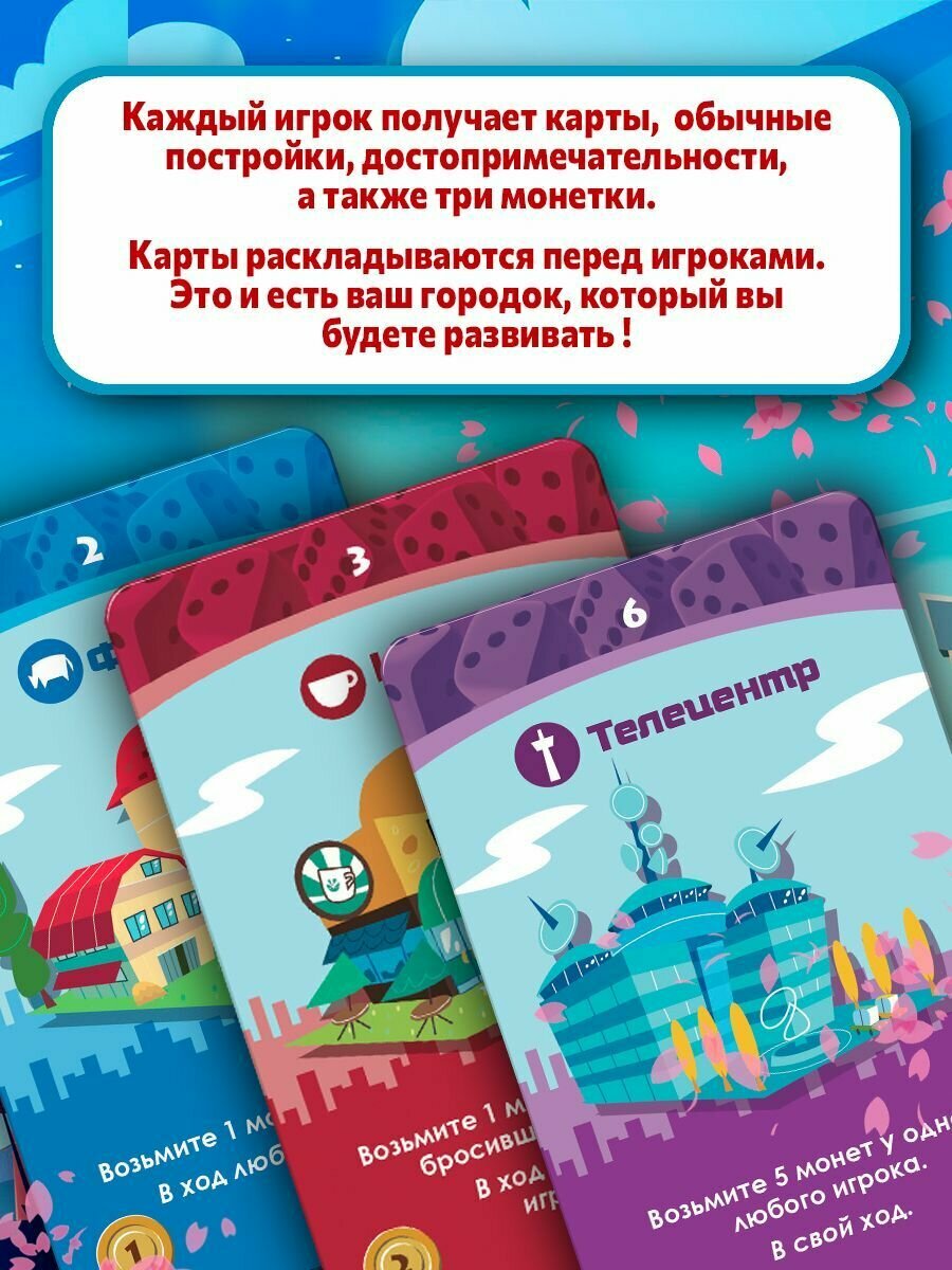 | Дополнительная информация | японская игра Machi Koro будет отличным подарком для любителей стратегических и экономических игр и всего японского. В настольной игре Мачи Коро нужно строить и зарабатывать. Также в игру включено дополнение "Мачи Коро плюс", которое расширит базовую игру и внесёт разнообразие в партии. Размер карт: 56х87 мм |