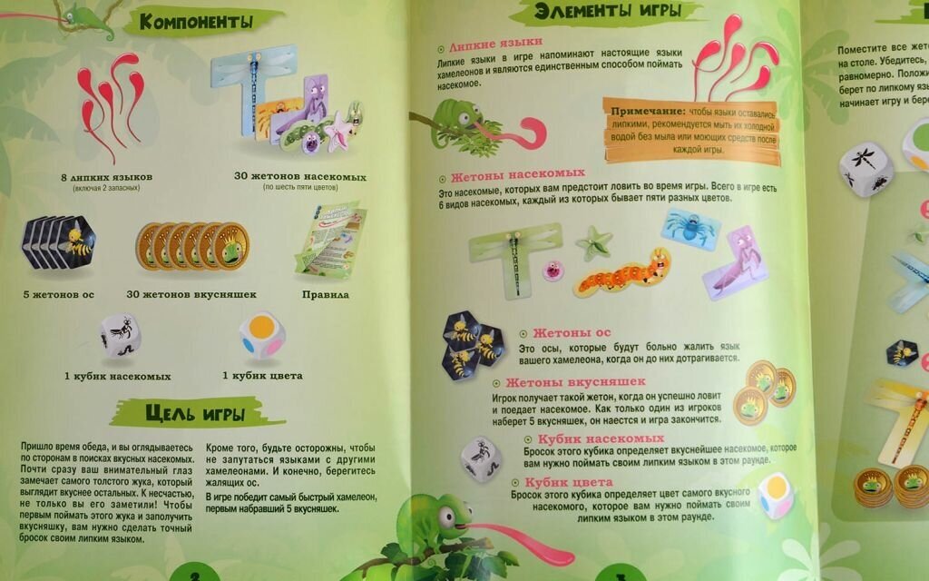 | Комплектация | 8 липких языков (включая 2 запасных), 30 жетонов насекомых, 5 жетонов ос, 30 жетонов вкусняшек, кубик насекомых, кубик цвета, правила |