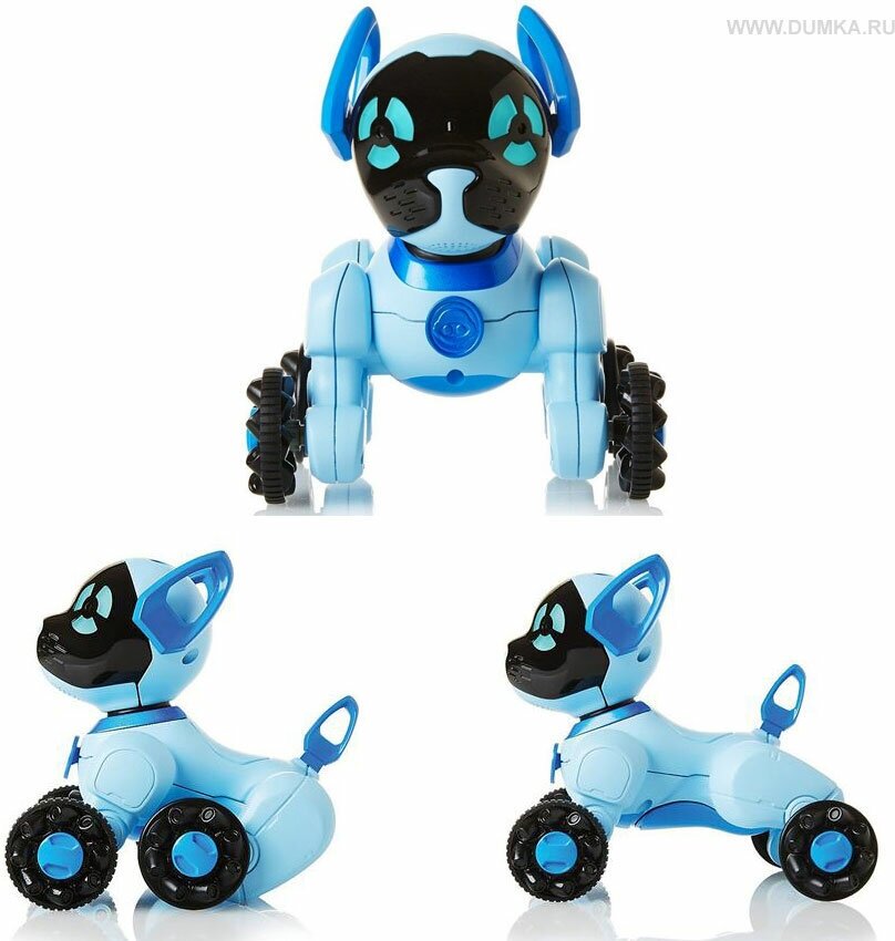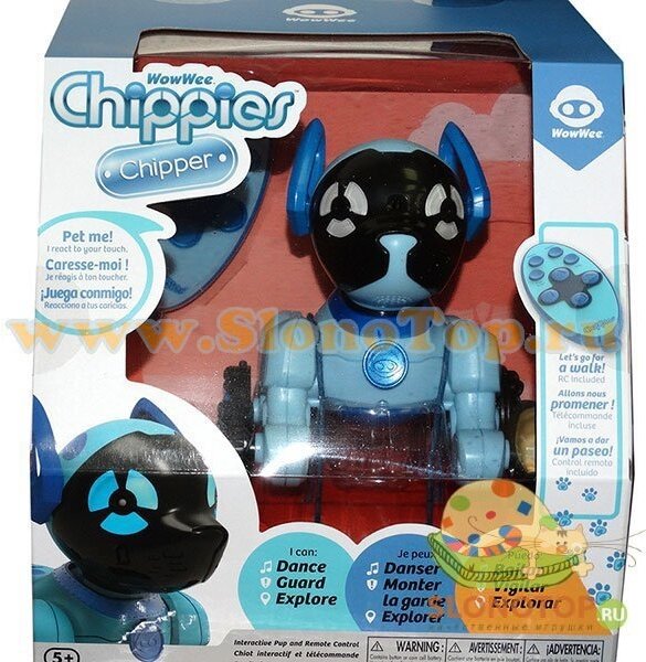| Дополнительная информация | функции:- работает в 7 игровых режимах: прогулка, охрана, танец, пение, лаянье, ожидание, сон; ведет себя как настоящий преданный пес: рычит, лает, нюхает, скулит, играет, воет, чихает, кашляет и целуется; при помощи пульта можно заставить Чиппи: вертеться за своим хвостом, танцевать, петь; с помощью датчиков он может: осмотреть комнату и даже охранять ее от незваных гостей; взаимодействует со взрослой собакой CHIP |