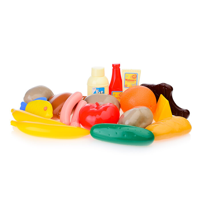 | Комплектация | Тележка для супермаркета / батон / курица / сосиски 2шт. / рыба / картофель 3шт. / огурец / помидор / апельсин / сыр / банан 2шт. / молоко / стейк / кетчуп / майонез. |