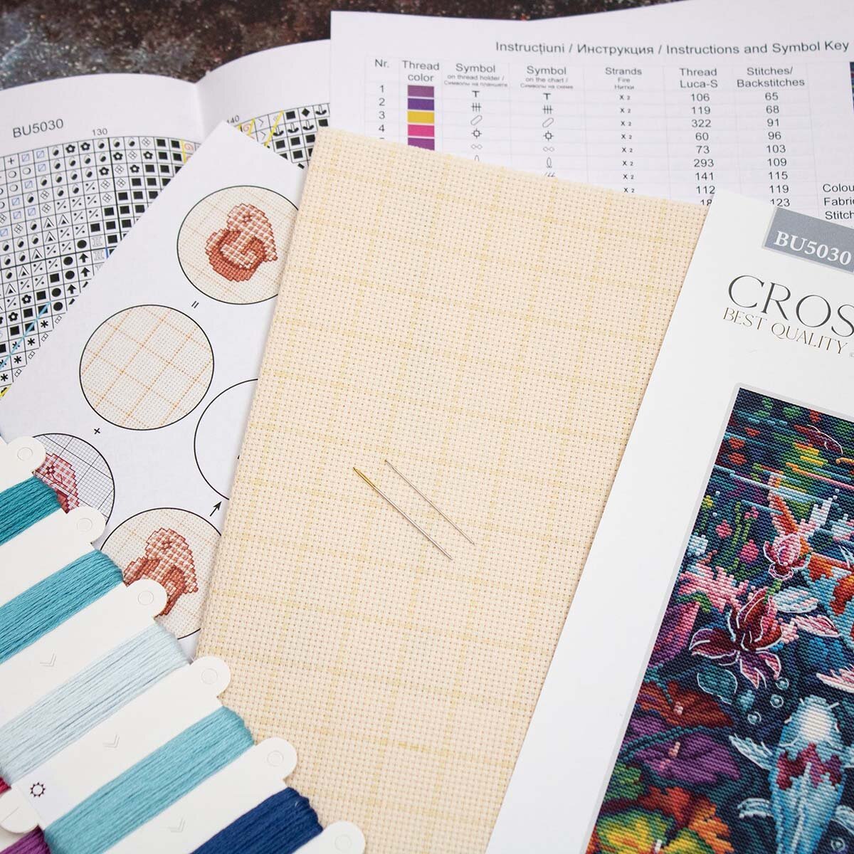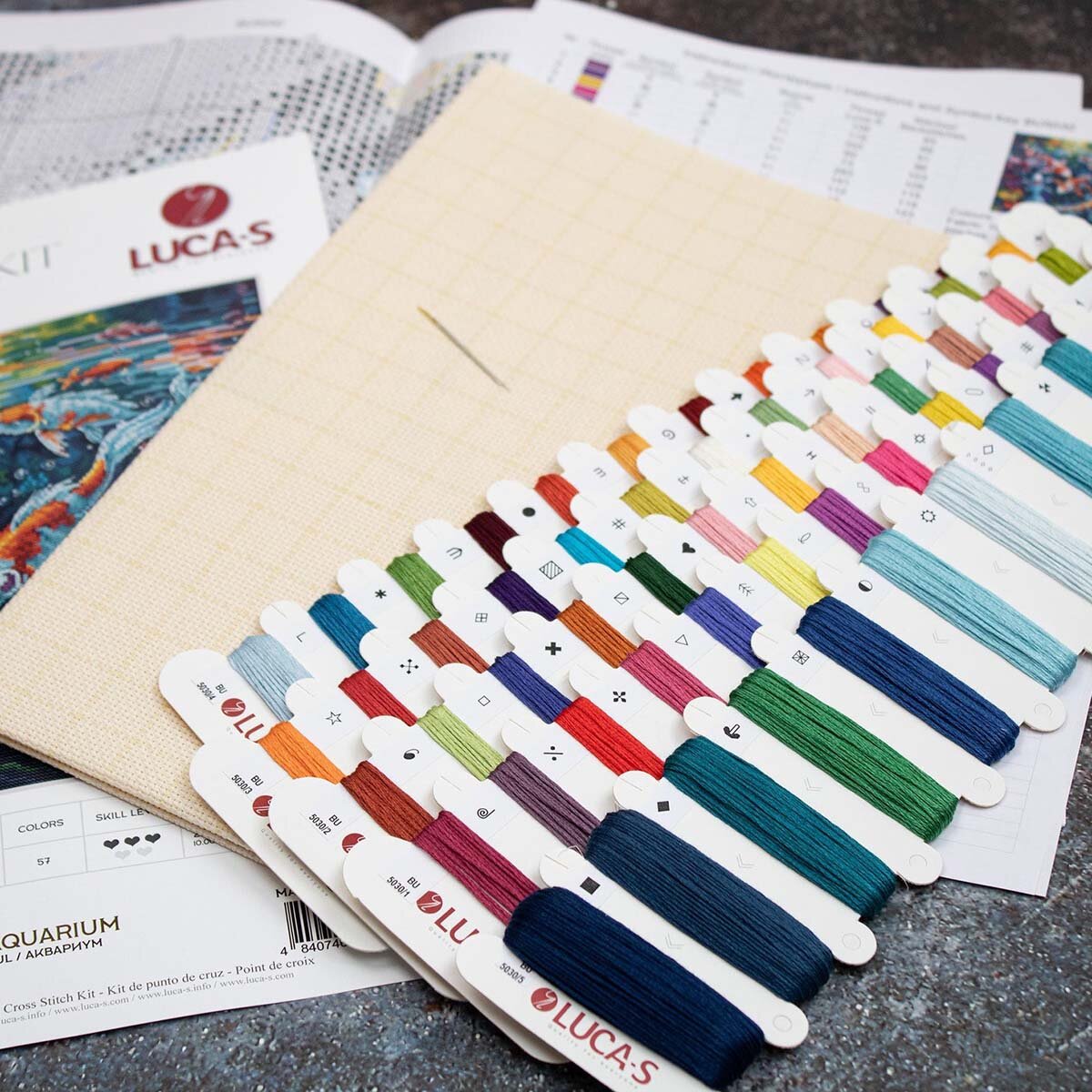 | Комплектация | Канва Aida 16 ct белая, хлопковое мулине Luca-S - 57 цв., игла №26 - 2 шт., черно-белая символьная схема, инструкция |
