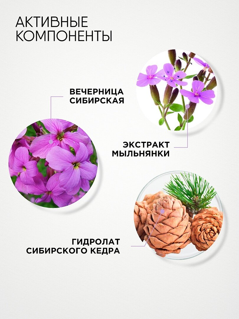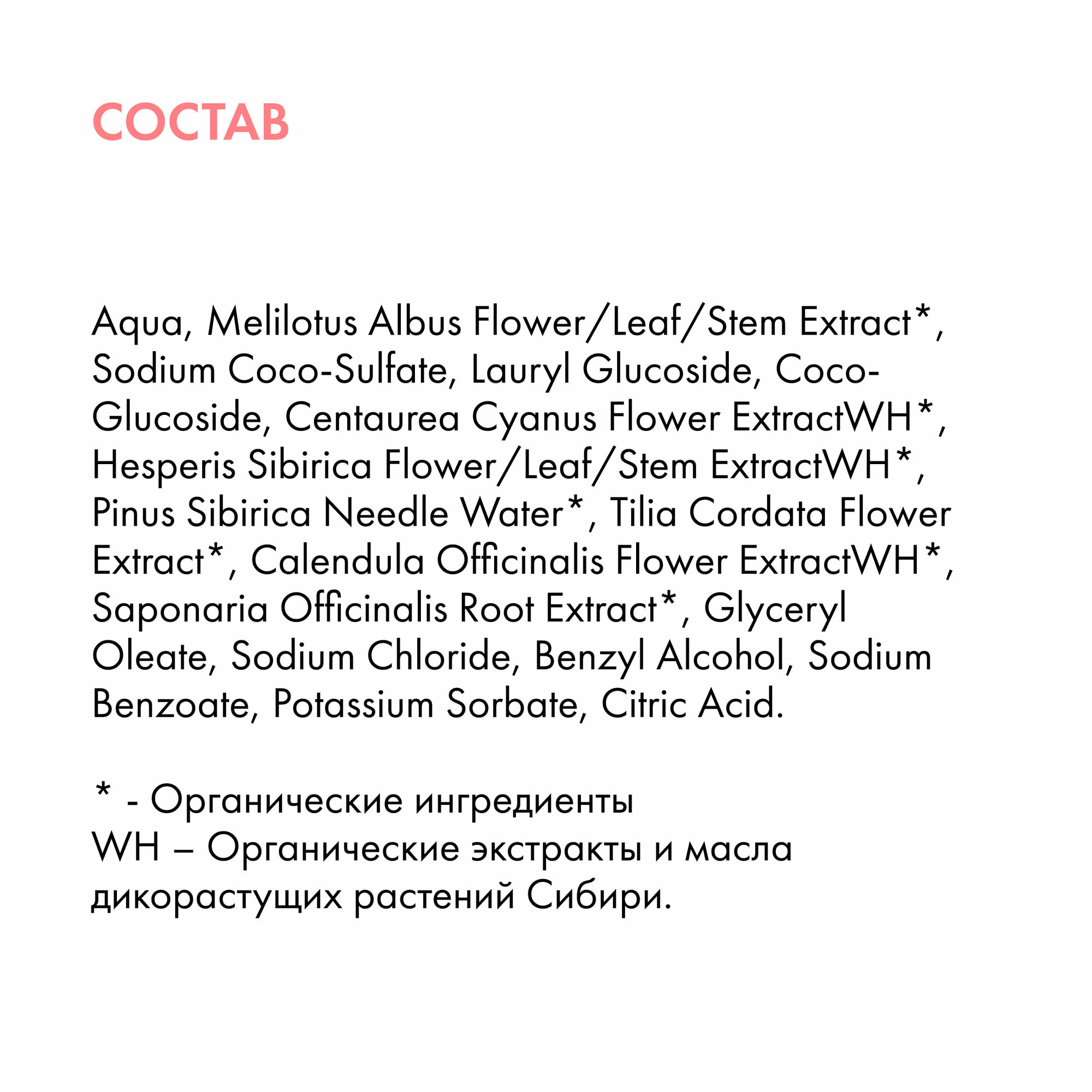 | Состав | Aqua, Melilotus Albus Flower/Leaf/Stem Extract, Sodium Coco-Sulfate, Lauryl Glucoside, Coco-Glucoside, Centaurea Cyanus Flower ExtractWH, Hesperis Sibirica Flower/Leaf/Stem ExtractWH, Pinus Sibirica Needle Water, Tilia Cordata Flower Extract, Calendula Officinalis Flower ExtractWH, Saponaria Officinalis Root Extract, Glyceryl Oleate, Sodium Chloride, Benzyl Alcohol, Sodium Benzoate, Potassium Sorbate, Citric Acid.() - Органические ингредиенты(WH) – Органические экстракты и масла дикорастущих растений Сибири. |