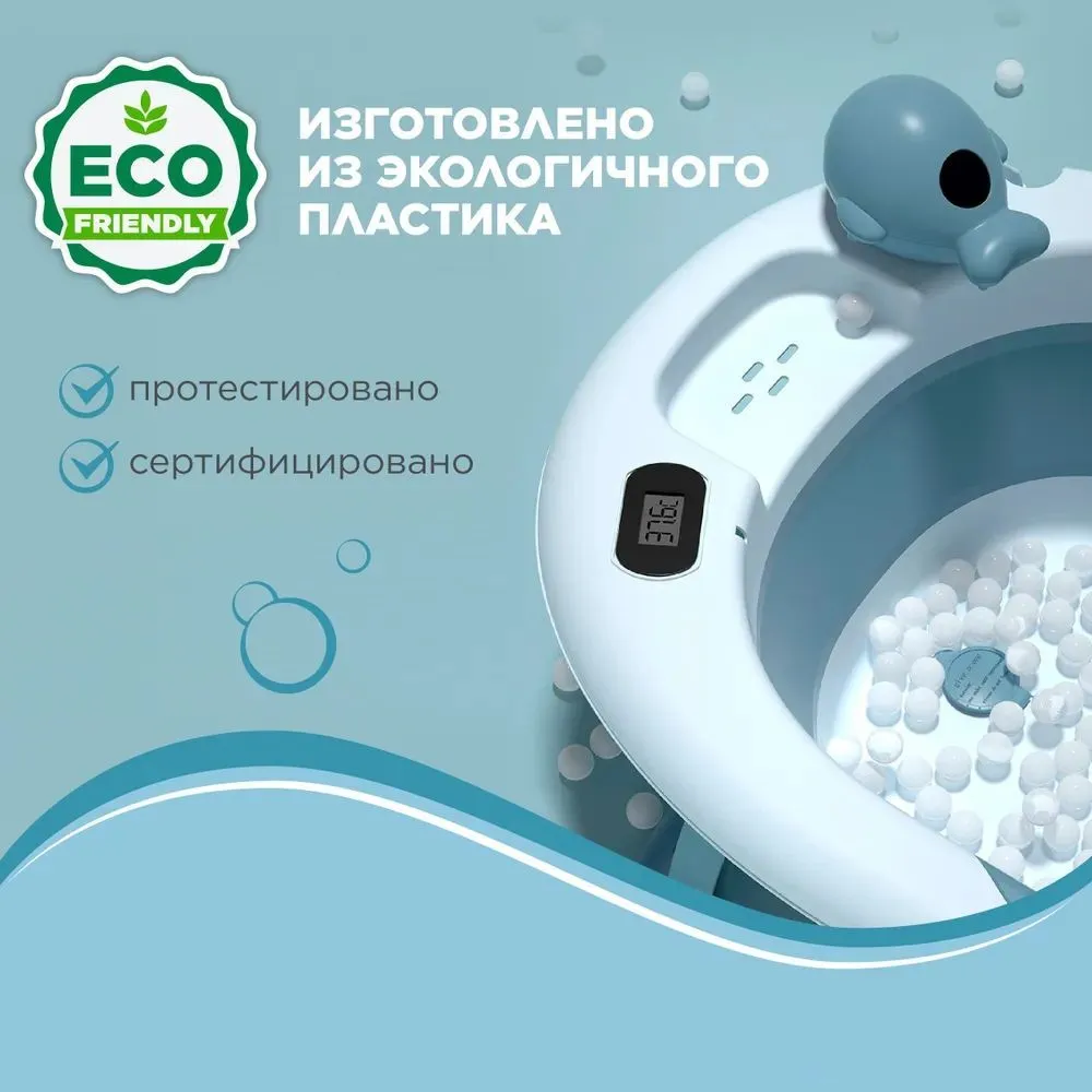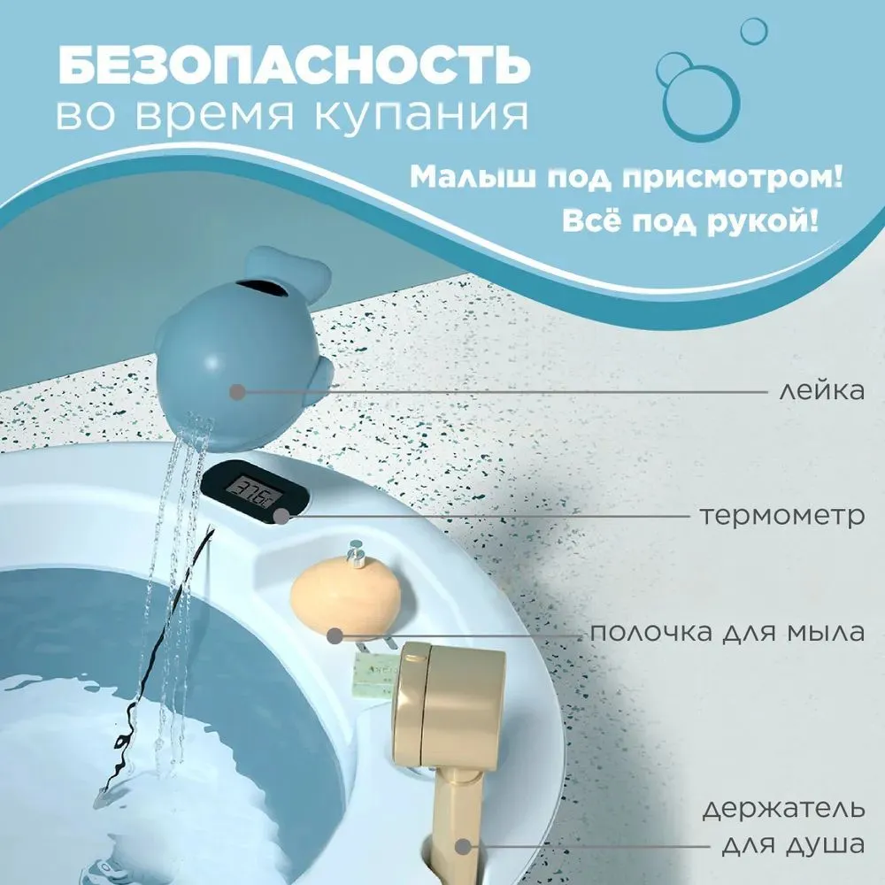 | Комплектация | - ванночка для купания новорожденных; - игрушка лейка, петля для подвешивания; - гамак для купания; - встроенный термометр для воды |