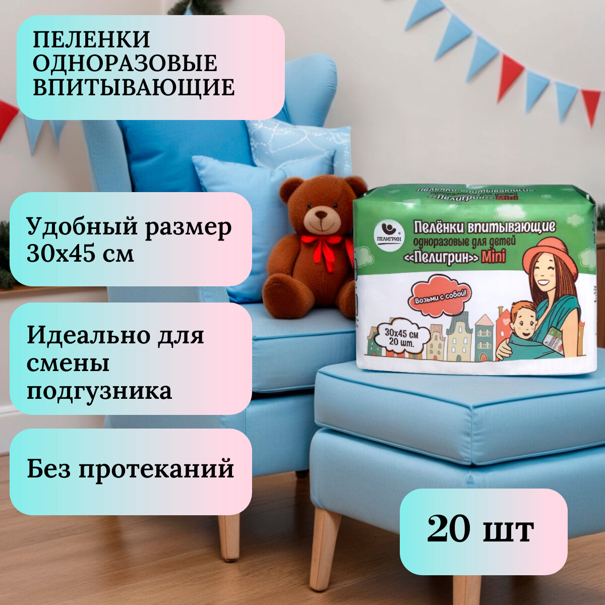 Пеленки впитывающие одноразовые для детей Пелигрин Mini, 30х45см, 20 шт. интересное: