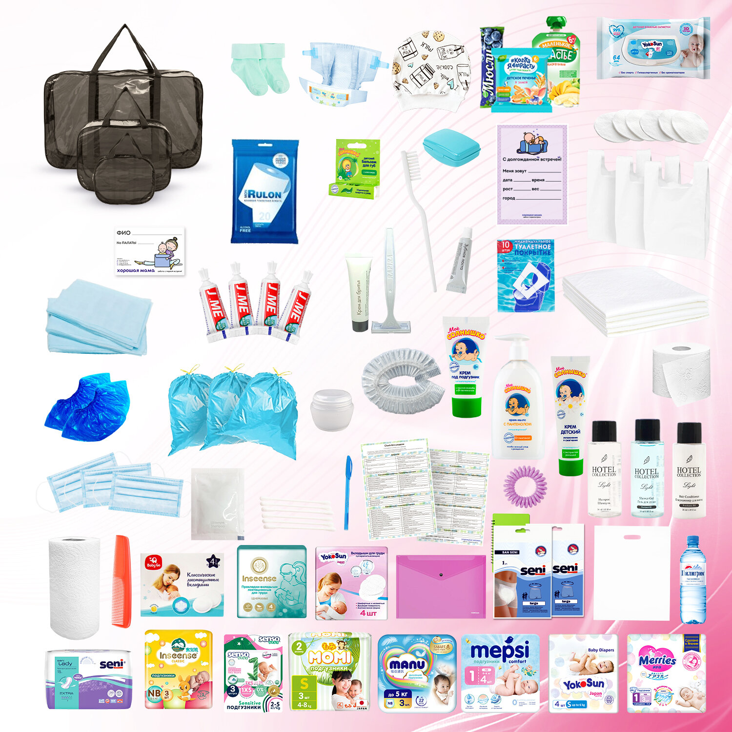 | Состав набора | бахилы, ватные диски, ватные палочки, влажная туалетная бумага, влажные салфетки, крем для сосков, мочалка, мыло, носочки для новорожденного, одноразовые маски, одноразовые покрытия на сиденье унитаза, пеленки для мамы, пеленки для новорожденного, подгузники, прокладки для груди, прокладки послеродовые, трусики, шапочка для душа, шапочка для новорожденного |