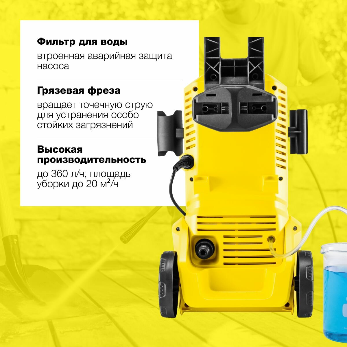 | Конструктивные особенности | встроенный бак для моющего средства / отсек для хранения принадлежностей / ручка для переноски / транспортировочные колеса |