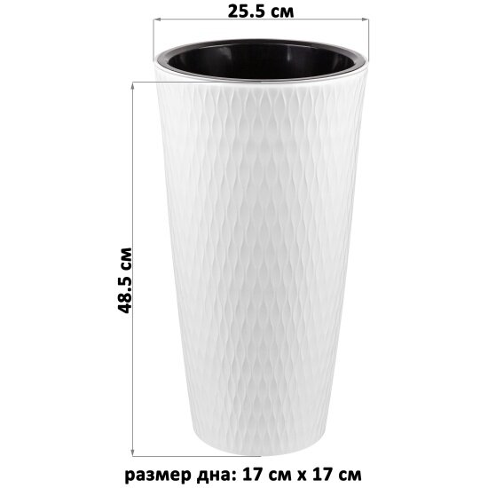 | Дополнительная информация | Кашпо "Керама" 25,5*25,5*48,5 см 15,5 л, белое, размер дна 17*17 см, с черным ведром внутри - 24,5*24,5*22,2 см 5,6 л |