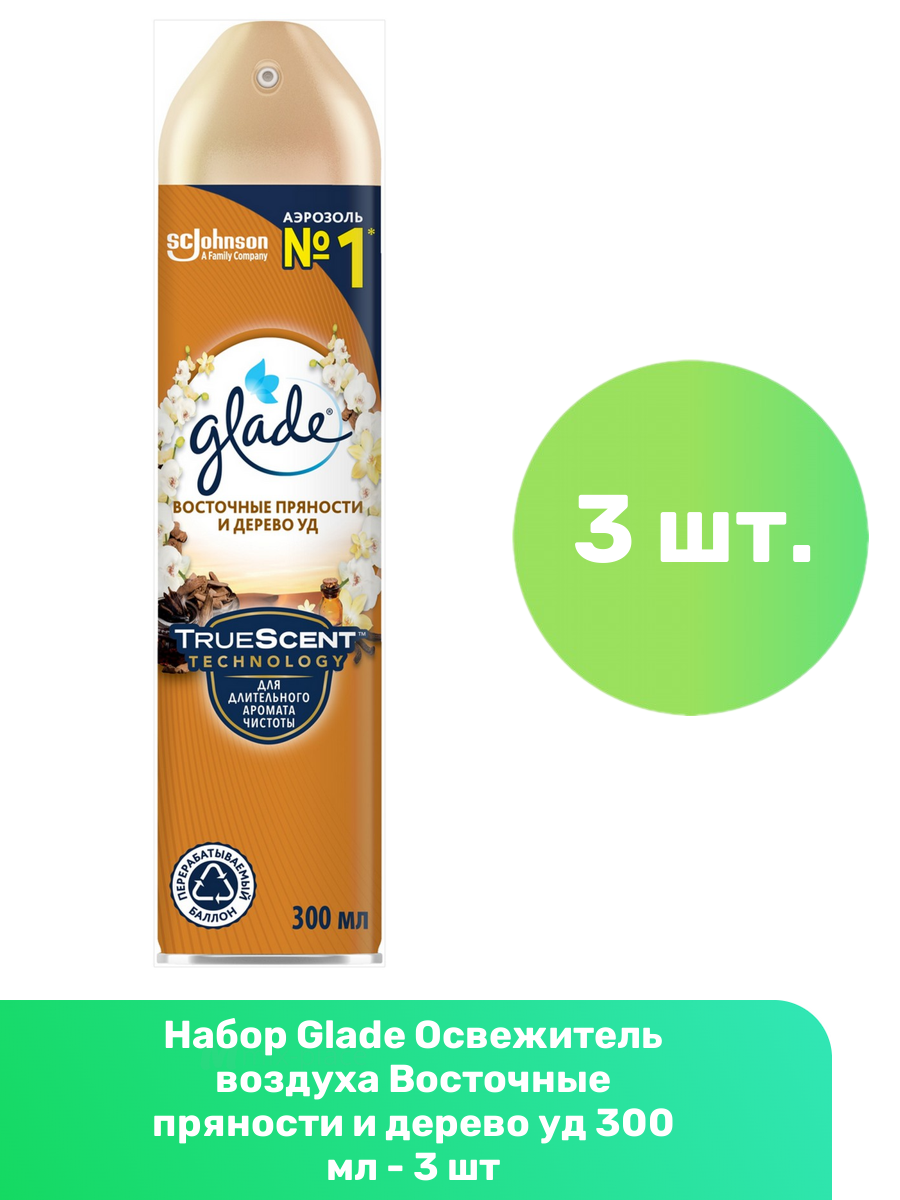 | Подробная комплектация | Освежитель воздуха Glade, восточные пряности и дерево уд, 300 мл, 3 шт. |
