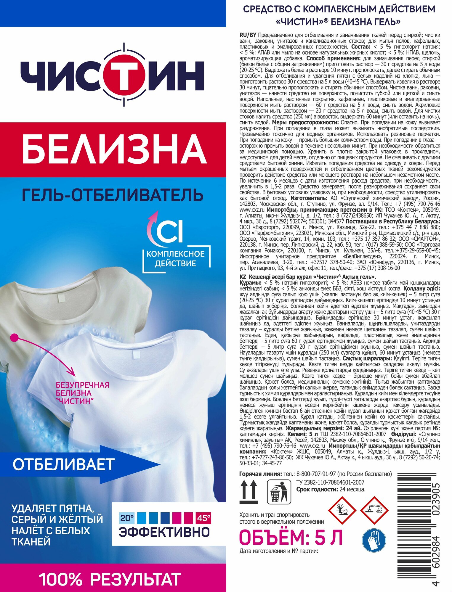 Средство для отбеливания и чистки тканей, с комплексным действием 5л чистин "Белизна гель",ш/к 23905 интересное: