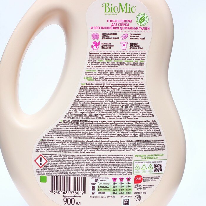 Купить Экологичный гель для стирки деликатных тканей BioMio, жидкий порошок концентрат, без запаха, 900 мл