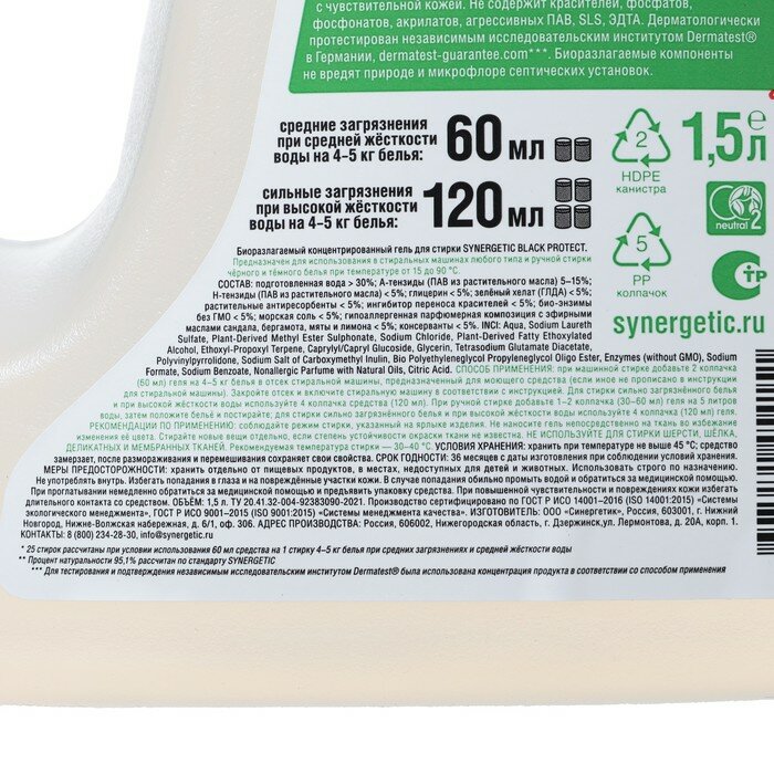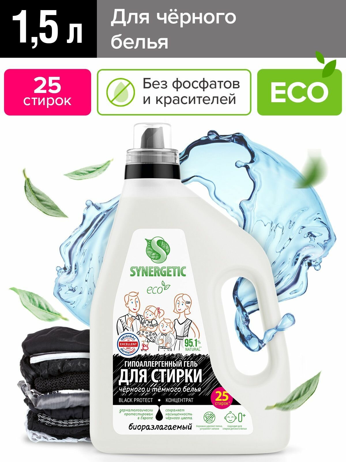 Купить Биоразлагаемый концентрированный гель для стирки SYNERGETIC BLACK PROTECT, 1,5 л (25 стирок)