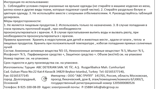 | Содержит | ПАВ / антибактериальный компонент / глицерин / кондиционер / консерванты / лимонная кислота / отбеливатель / пятновыводитель / фосфонат / энзимы |