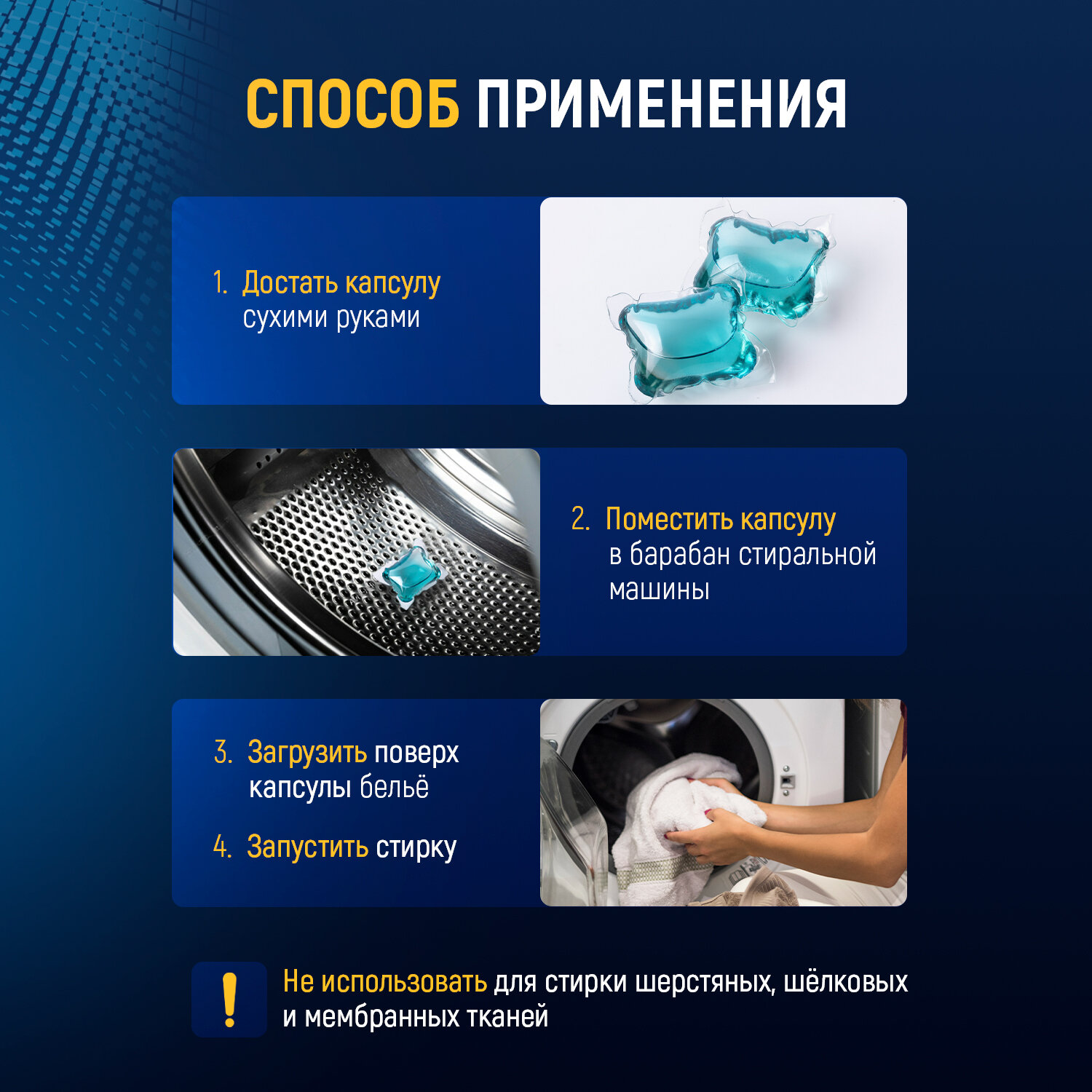 | Способ применения | Одна капсула рассчитана на стирку белья до 3 кг. Если белья больше, используйте 2 и более капсул. |