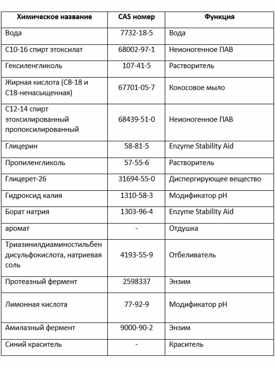 | Состав | Более 30% неионогенных ПАВ,5 -15% мыло,энзимы,отдушка |