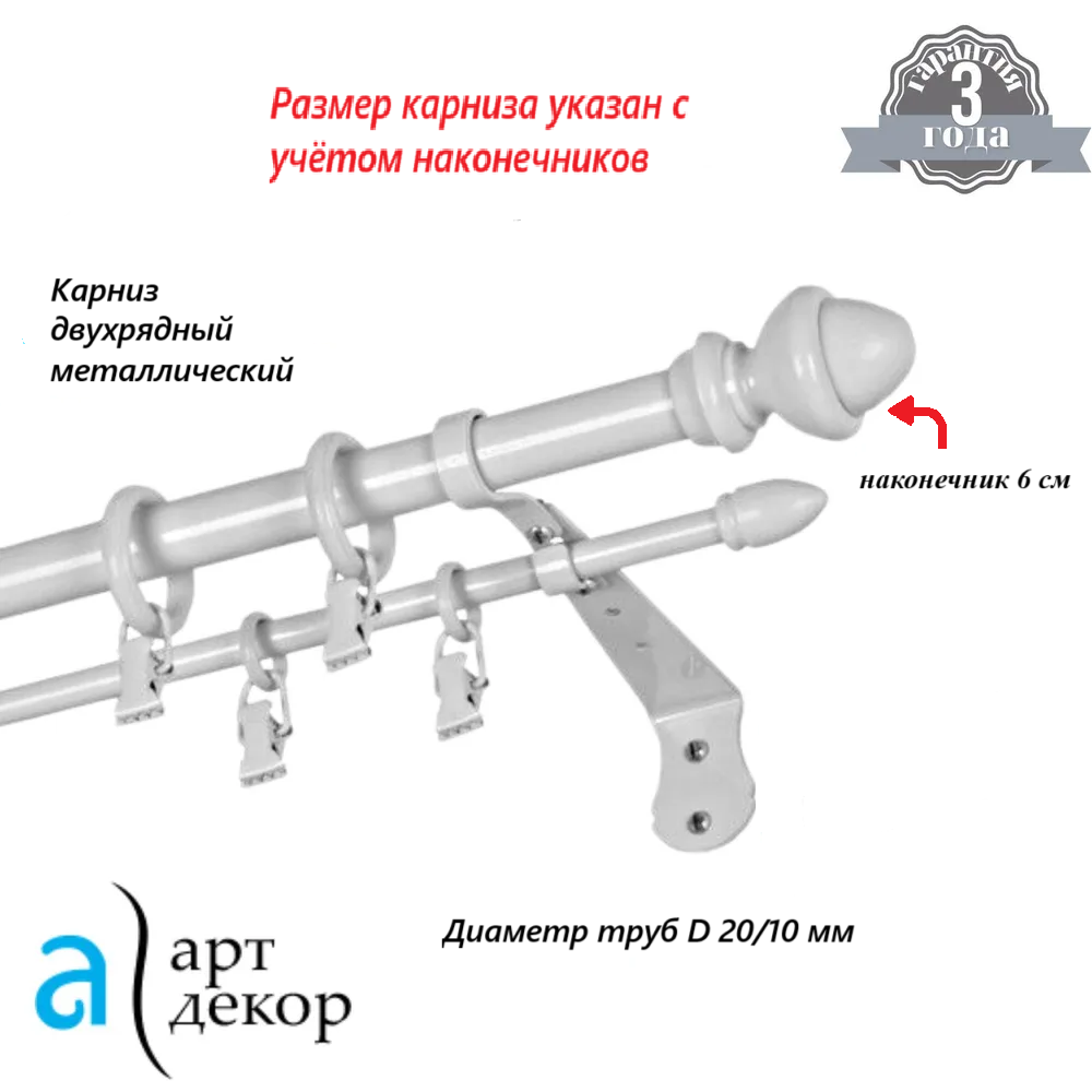 | Комплектация | Штанга d20, штанга d10, кронштейны, кольца с зажимами, декоративный наконечник. Всё для монтажа, инструкция. |