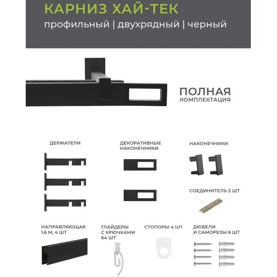 | Комплектация | Направляющая - 2 шт (для длины 320 см - 4 шт), держатели 2-рядные - 2 шт для длины 200 см, 3 шт для длин 240 и 320 см, наконечники для 1-го ряда - 2 шт, наконечники-заглушки для 2-го ряда - 2 шт, глайдеры к профилю, крючки для глайдера, стопор для профиля - 4 шт, соединитель - 2 шт. (только для длины карниза 320 см) |