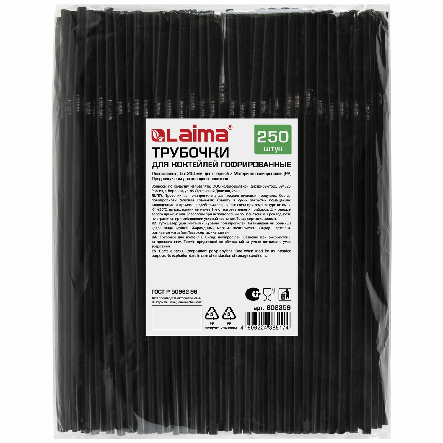 Трубочки для коктейлей гофрированные, пластиковые 5 х 240 мм, черные комплект 250 штук, LAIMA, 608359, 608359
