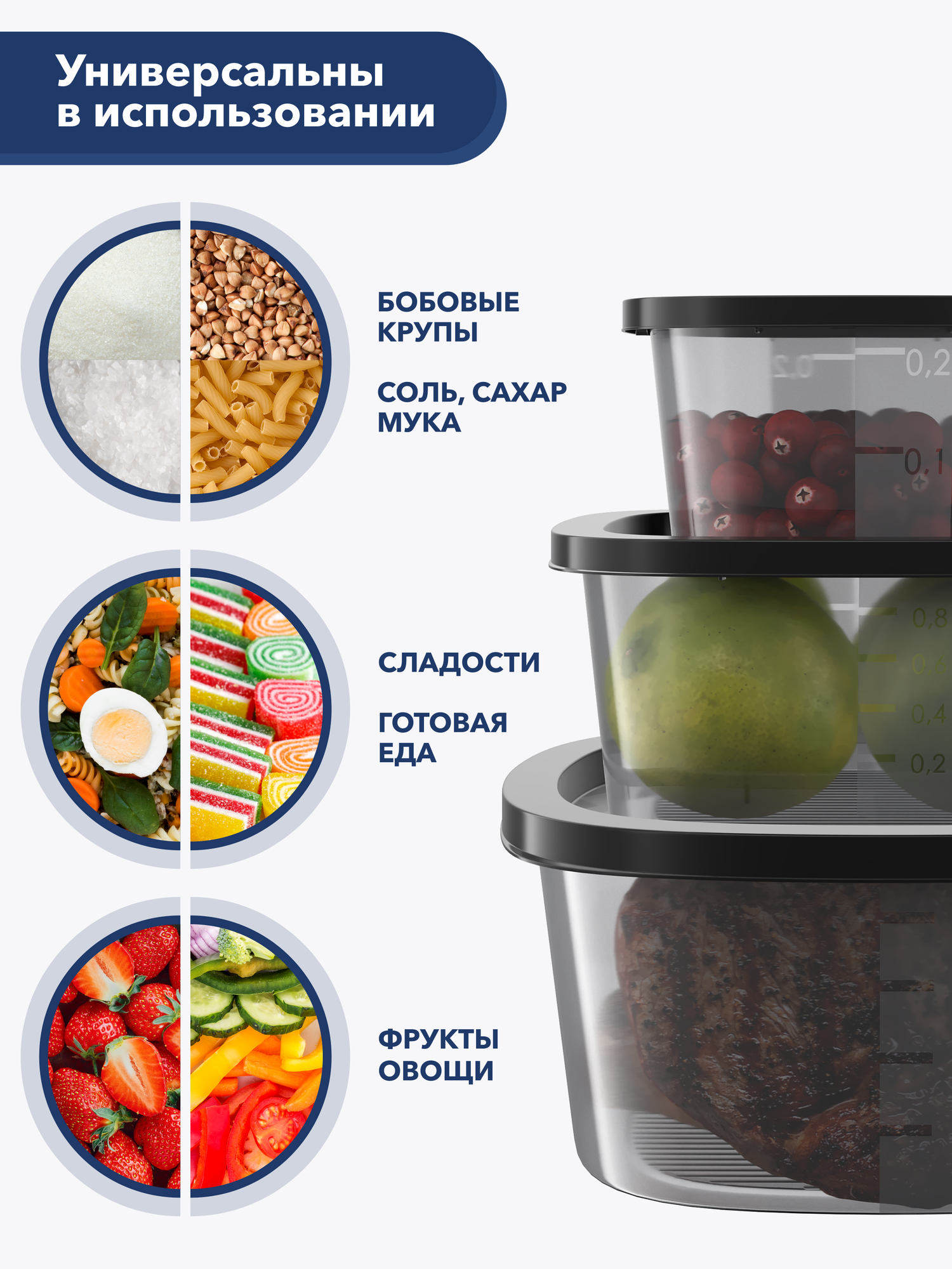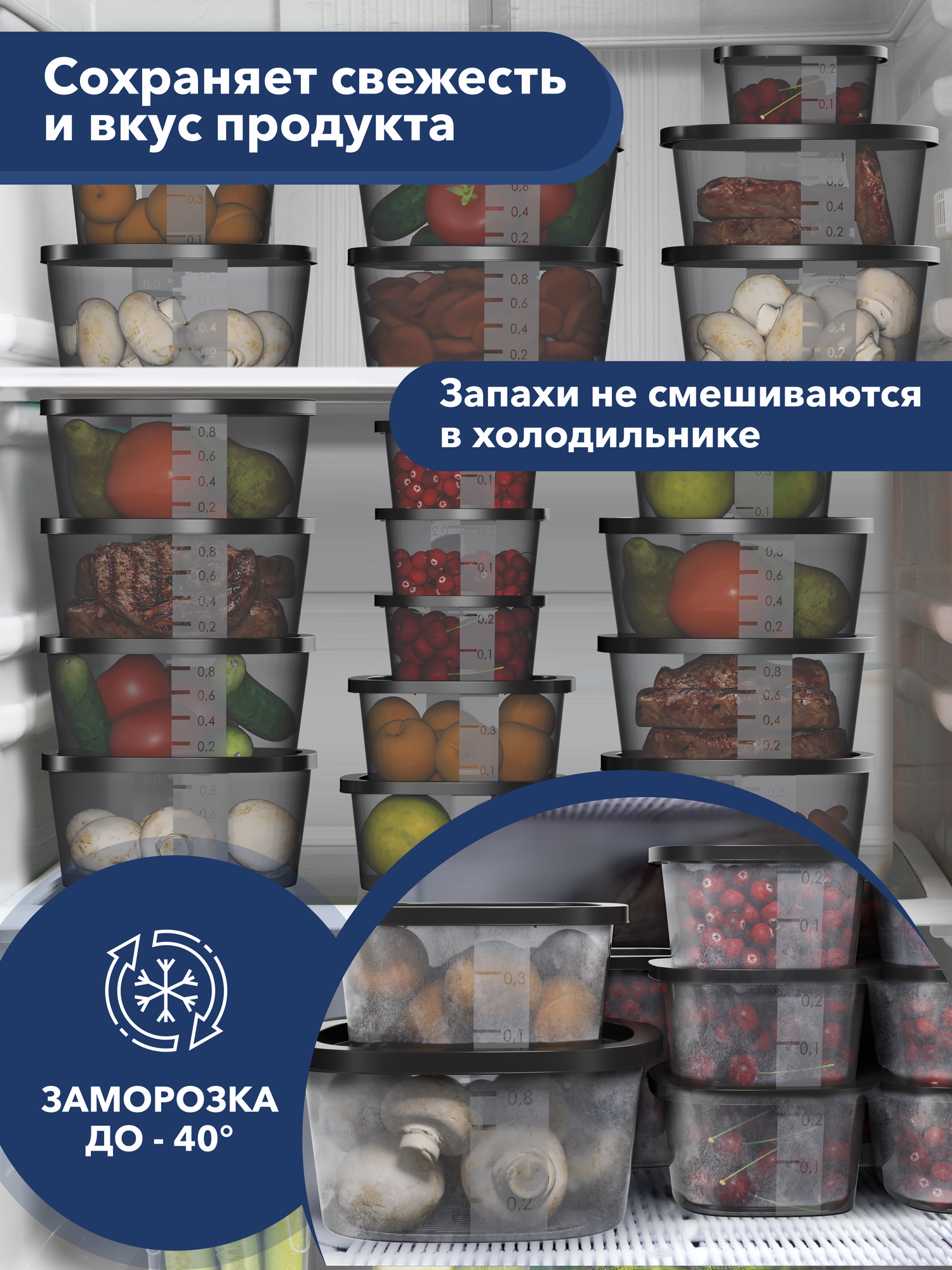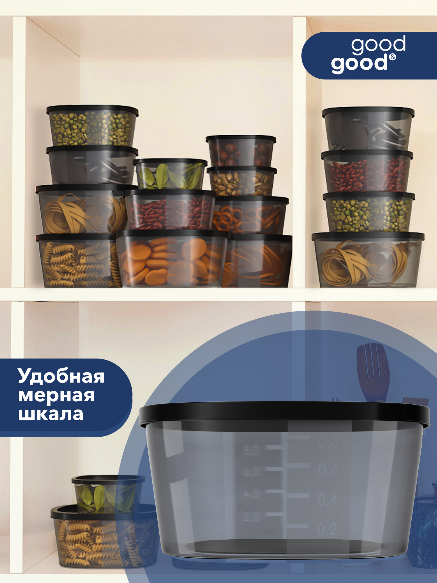 Контейнер для еды и хранения продуктов 15 шт good&good набор контейнеров для еды, черные крышки