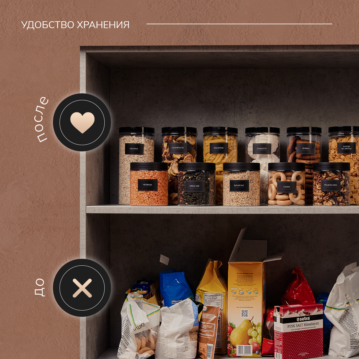 | Дополнительная информация | Набор баночек для порядка на кухне: 7 шт для специй и приправ, 10 шт для бакалеи, 1 шт для спагетти. Баночки позволят убрать визуальный шум , а также вы всегда будете знать какой продукт в каком количестве. |