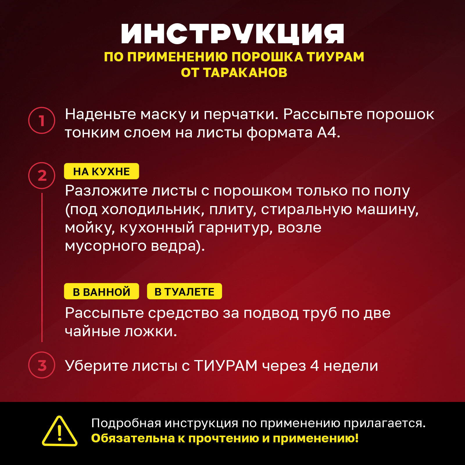 | Способ применения | обязательно перед обработкой нужно надеть резиновые перчатки, защитную маску и защитные очки (подойдут любые). Затем берем листок А4 или газету или коробочку с невысокими бортиками, также подойдут одноразовые тарелки рассыпаем порошок Тиурам тонким слоем 2-3 сайные ложки на одну приманку и раскладываем готовые приманки для тараканов в местах недоступных для детей и домашних животных, т.е под холодильник, под кухонный гарнитур, под раковину, плиту и т.д. В ванной комнате разложить под ванну, стиральную машину. Раскладываем только по полу и только в труднодоступных местах. Покидать помещение нет необходимости, но делать дополнительные проветривания рекомендовано. |