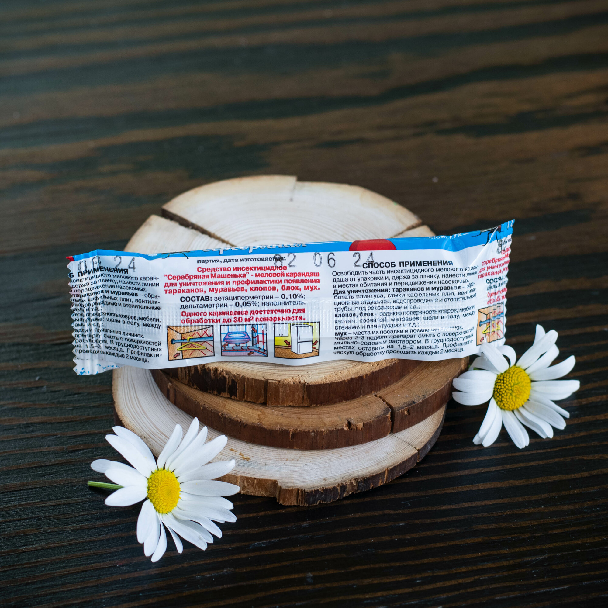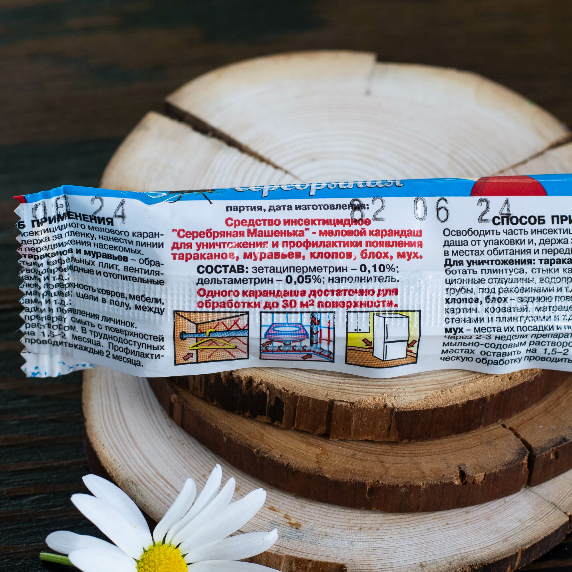 | Способ применения | освободить часть инсектицидного мелового карандаша от упаковки; держа за пленку, нанести линии в местах обитания и передвижения насекомых; для уничтожения тараканов и муравьев: обработать плинтуса, стыки кафельных плит, вентиляционные отдушены, водопроводные и отопительные трубы, под раковинными и т.д; для уничтожения клопов и блох: заднюю поверхность ковров, мебели, картин, кроватей, матрацев, щели в полу, между стенами и плинтусами и т.д.; для уничтожения мух: места их посадки и появление личинок; через 2-3 недели препарат смыть с поверхностей мыльно-содовым раствором; в труднодоступных местах оставить на 1,5-2 месяца; профилактическую обработку проводить раз в 2 месяца |