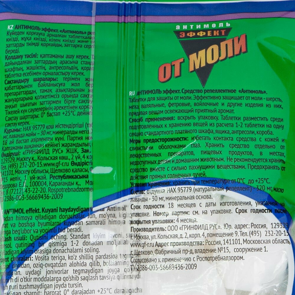 | Способ применения | вскрыть упаковку. Таблетки разместить среди подготовленных к хранению вещей из расчета 1-2 таблетки на одну секцию стандартного платяного шкафа, ящика, антресоли, короба |