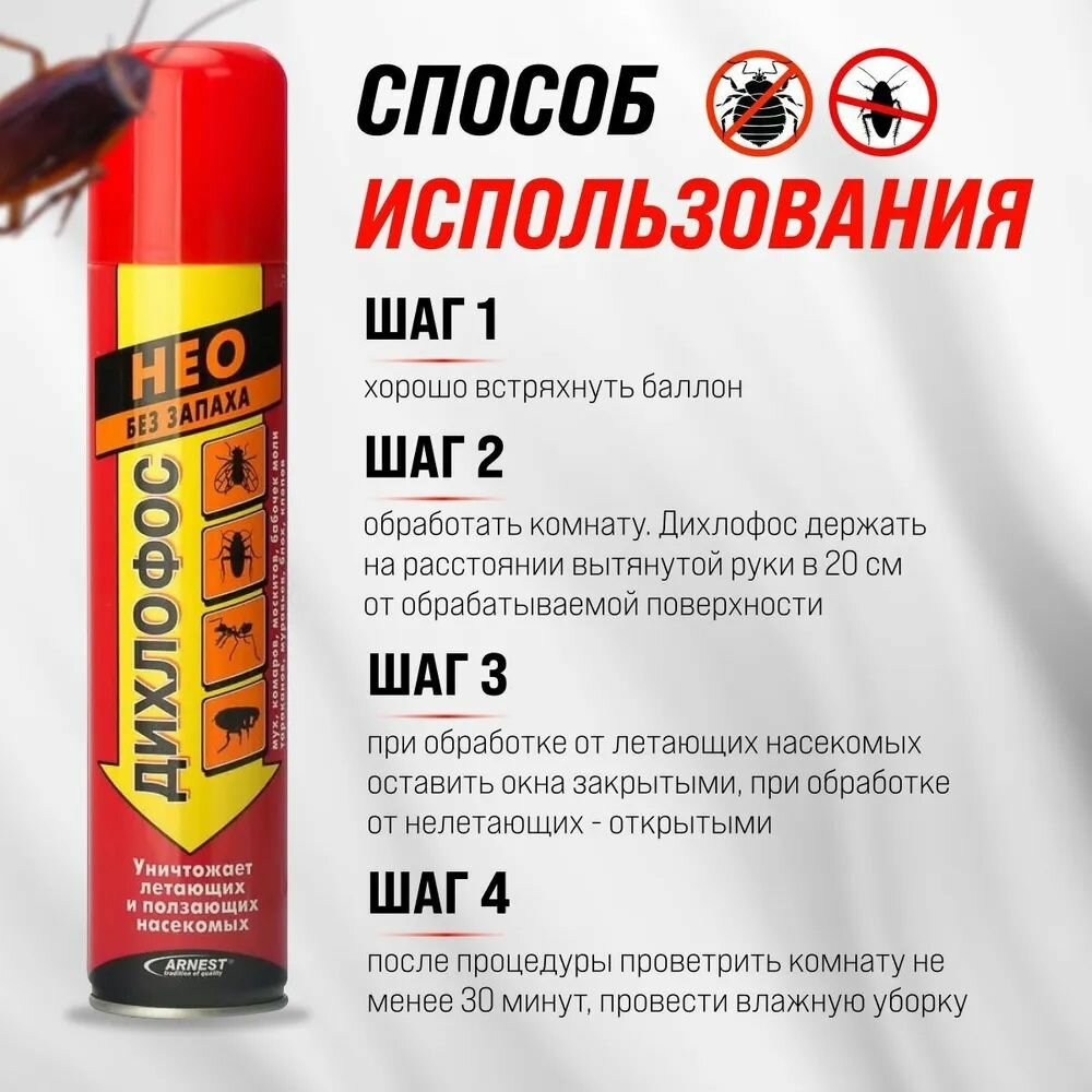 | Способ применения | Применение Дихлофоса от насекомых "Нео" очень простое. Для начала необходимо тщательно встряхнуть баллон перед использованием. Затем направьте распылитель на насекомых или места, где они обитают, и нажмите на кнопку распылителя. Рекомендуется проводить обработку вечером или ночью, когда насекомые наиболее активны. |
