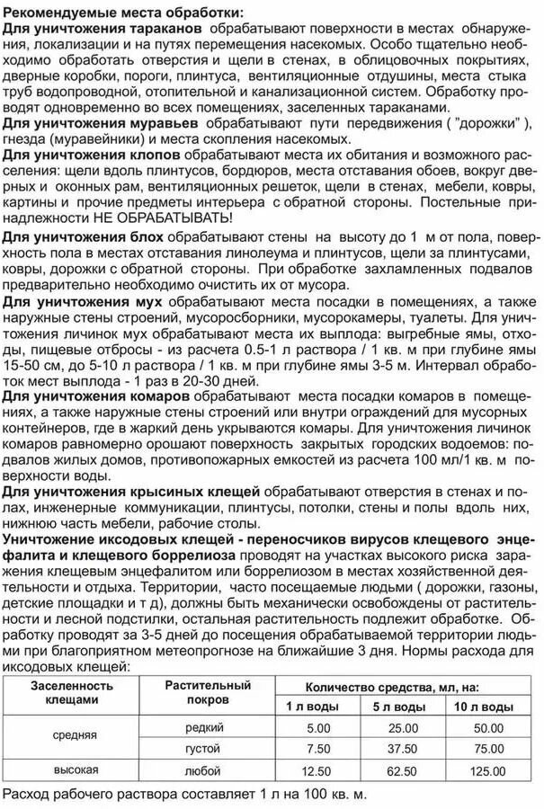 | Способ применения | Средство необходимо развести с водой в пропорциях: иксодовые клещи: 12,5 мл на 1 литр; тараканы: 4 мл на 1 л; клопы, муравьи, мухи: 2 мл на 1 л; блохи, комары, крысиные клещи: 1 мл на 1 л. С помощью любого опрыскивателя обработать места обитания насекомых. 100 мл средства достаточно для обработки 10 соток дачного участка. Соблюдайте меры предосторожности. |