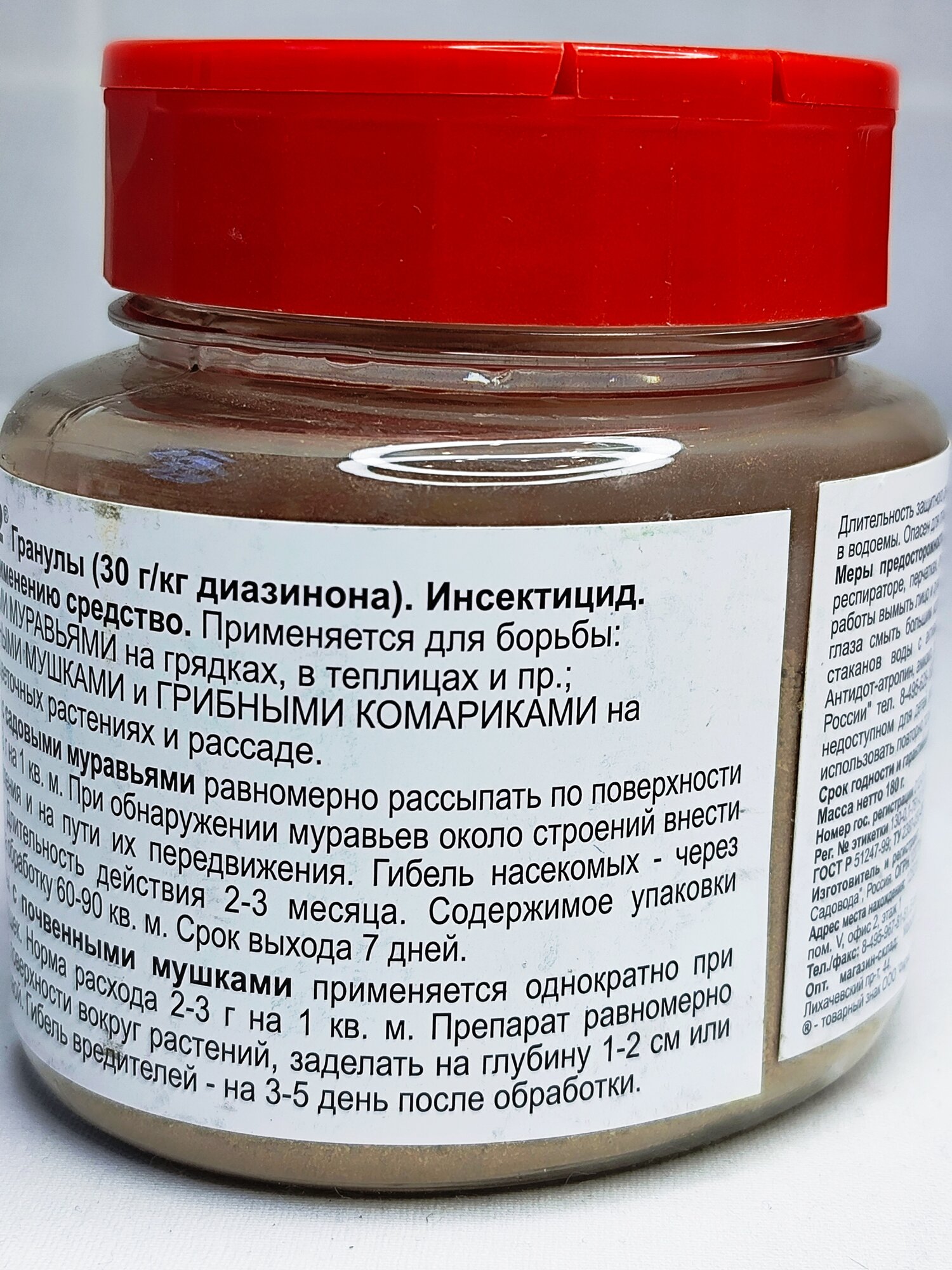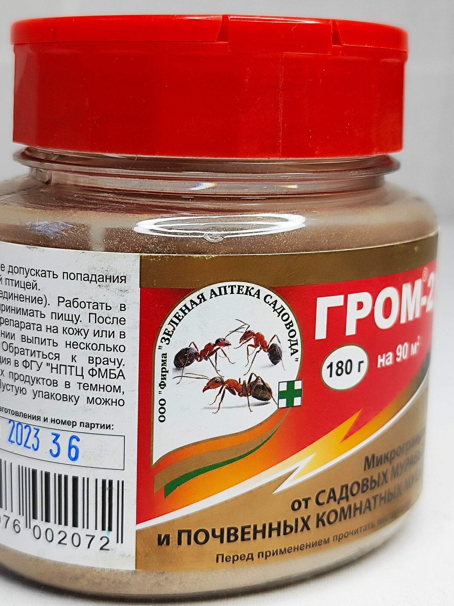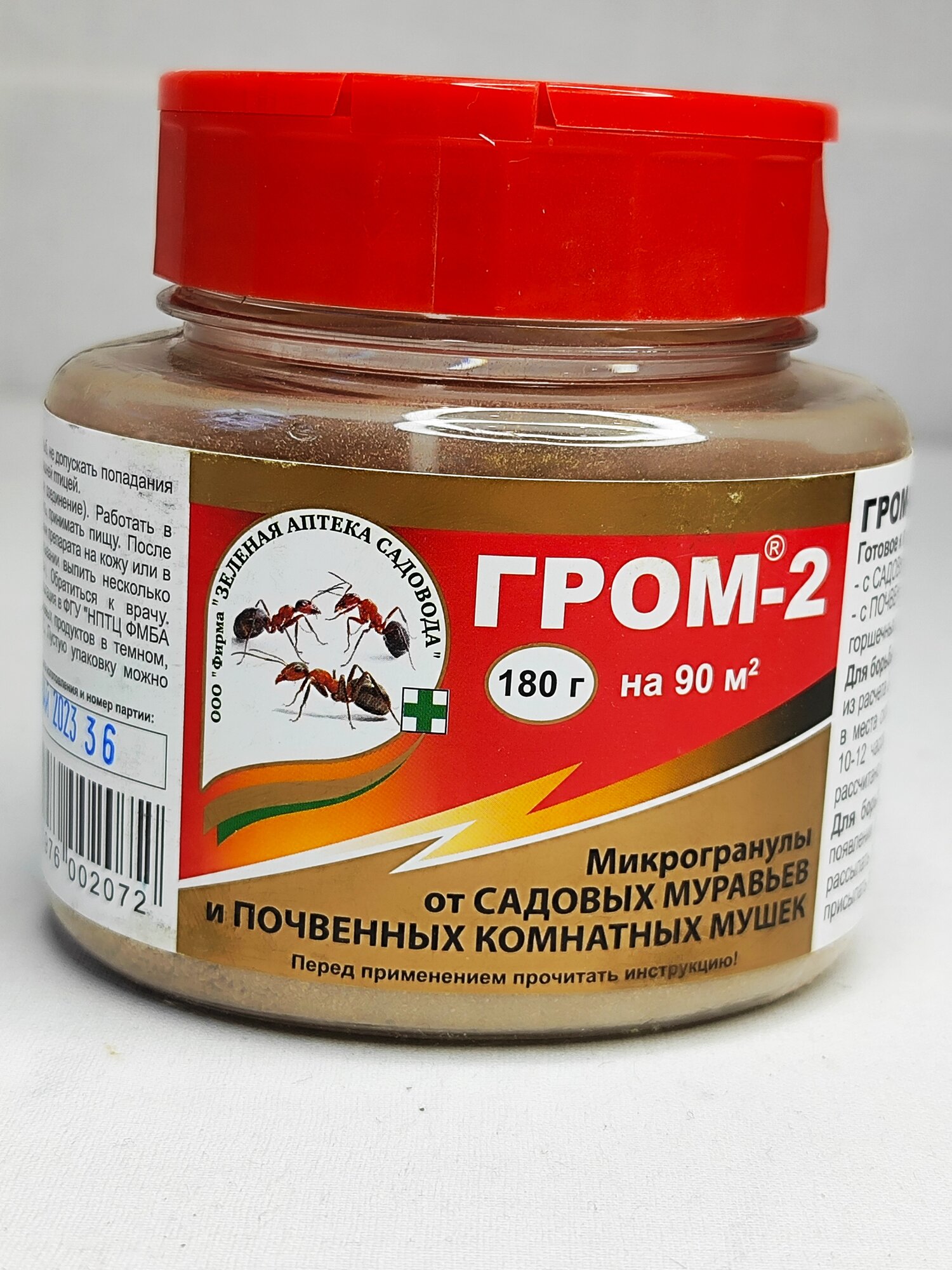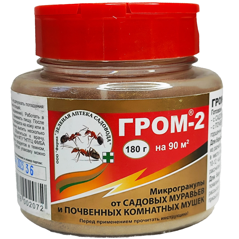 | Дополнительная информация | редство от муравьев «Гром-2» — химический инсектицид, предназначенный для истребления муравьев, почвенных мошек, грибных комаров в горшках комнатных растений и на приусадебном участке. Для достижения результатов необходимо внести препарат в толщу почвы на глубину 1–2 см по пути следования муравьев или в местах скопления насекомых. Муравьи гибнут спустя 3–5 дней после контакта с действующим веществом препарата. Защитное действие сохраняется 2–3 месяца, достаточно купить препарат 1–2 раза на сезон. Упаковки в 10 г хватает для обработки 8–10 м2 почвы. |