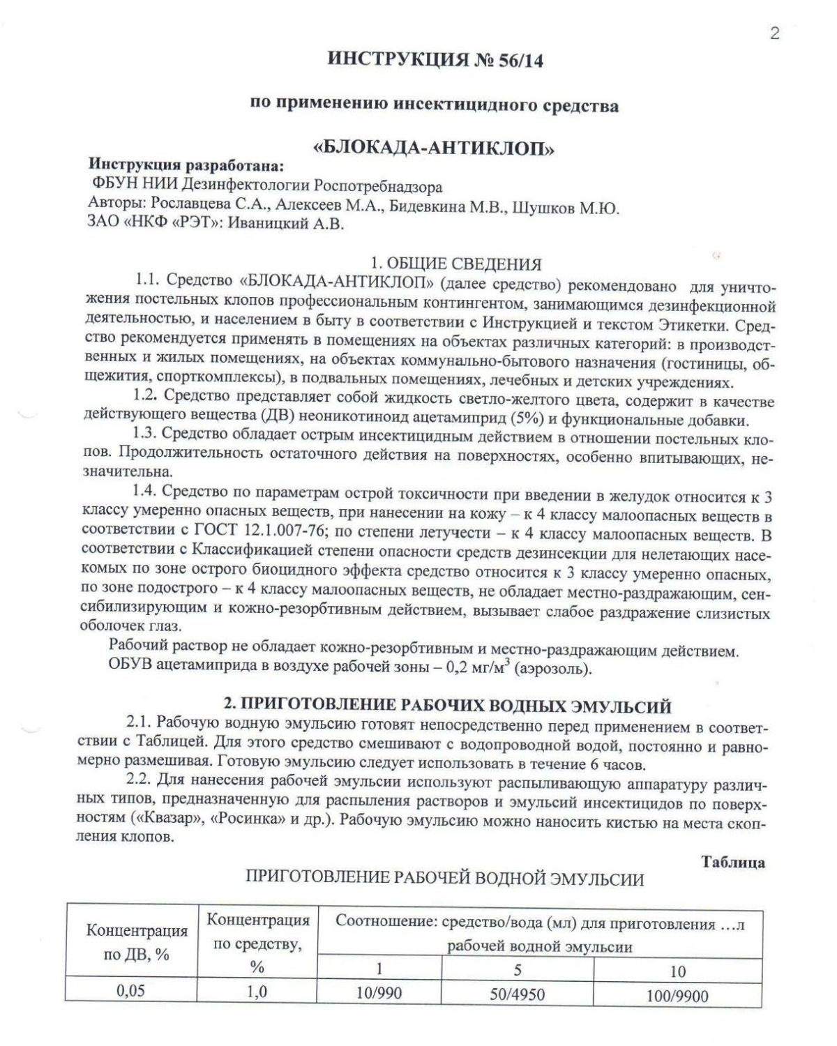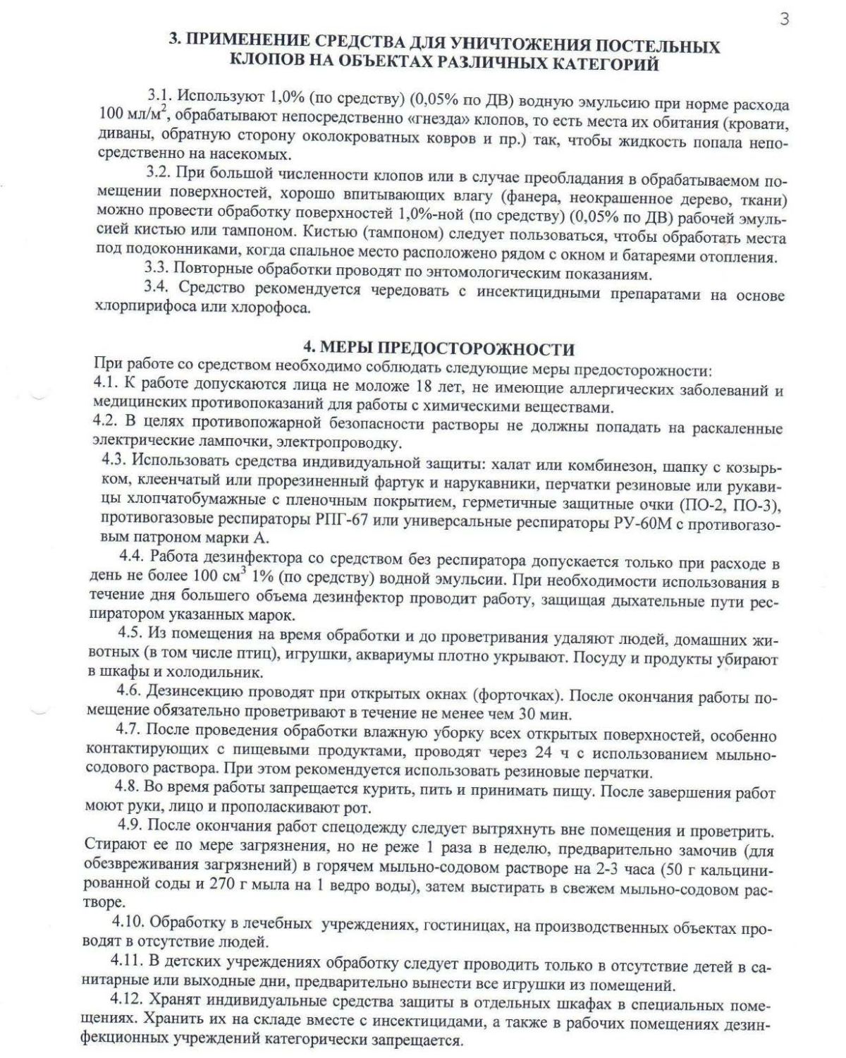 | Способ применения | Рабочий раствор готовится в соотношении 10 мл концентрата на 1 литр воды, при большой численности заряжения увеличивает соотношение до 20 мл на 1 литр. Для нанесения рабочей эмульсии используется распылитель, на места кладок яиц и скопления клопов наносить можно кистью. Если потребуется повторная обработка рекомендуется чередовать с другими препаратами, чтобы предотвратить привыкание клопов к препарату. Необходимо обработать: щели кроватей, диванов и низ мебели, швы матрасов, подушек, одеял, задняя сторона ковров, картин и бра, выдвижные полки прикроватных тумбочек и комодов, щели в плинтусах и радиаторы отопления, щели между обоями и отстающие их края, прикроватные выключатели и розетки (заранее обесточьте). Норма расхода готового раствора 100мл/1м2. |