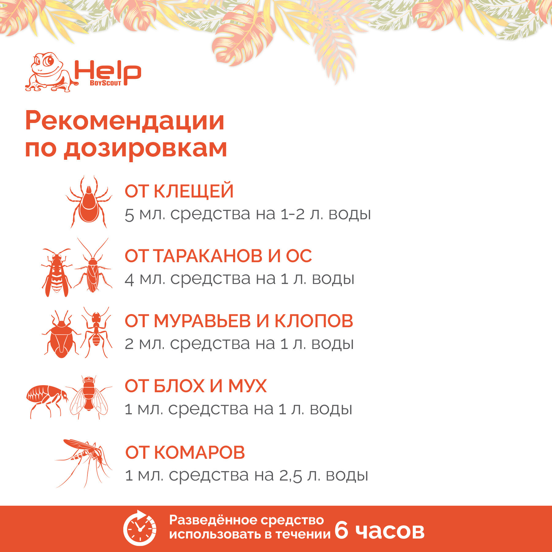 | Способ применения | уничтожение клещей: для обработки 100 кв. м. поверхности участка от таежных и лесных клещей на 5 мл концентрата добавить 1-2 л воды и тщательно перемешать; если на участке встречаются другие клещи, или вид клещей неизвестен, следует развести 12 мл концентрата в 1-2 л воды и тщательно перемешать; разведенное средство использовать в течение 6 часов; проводить обработку за 3 дня до приезда на территорию людей; перед применением средства механически расчистить участок, после обработать средством, применяя любой тип опрыскивателя, продвигаясь зигзагом от дальнего участка к ближнему, захватывая также низкие кустарники высотой до 50 см; при необходимости повторную обработку проводить через 2 недели после предыдущей; для уничтожения тараканов, ос – 4 мл концентрата на 1 л воды, муравьев, клопов – 2 мл концентрата на 1 л воды, блох, мух – 1 мл концентрата на 1 л воды, комаров – 1 мл концентрата на 2,5 л воды |