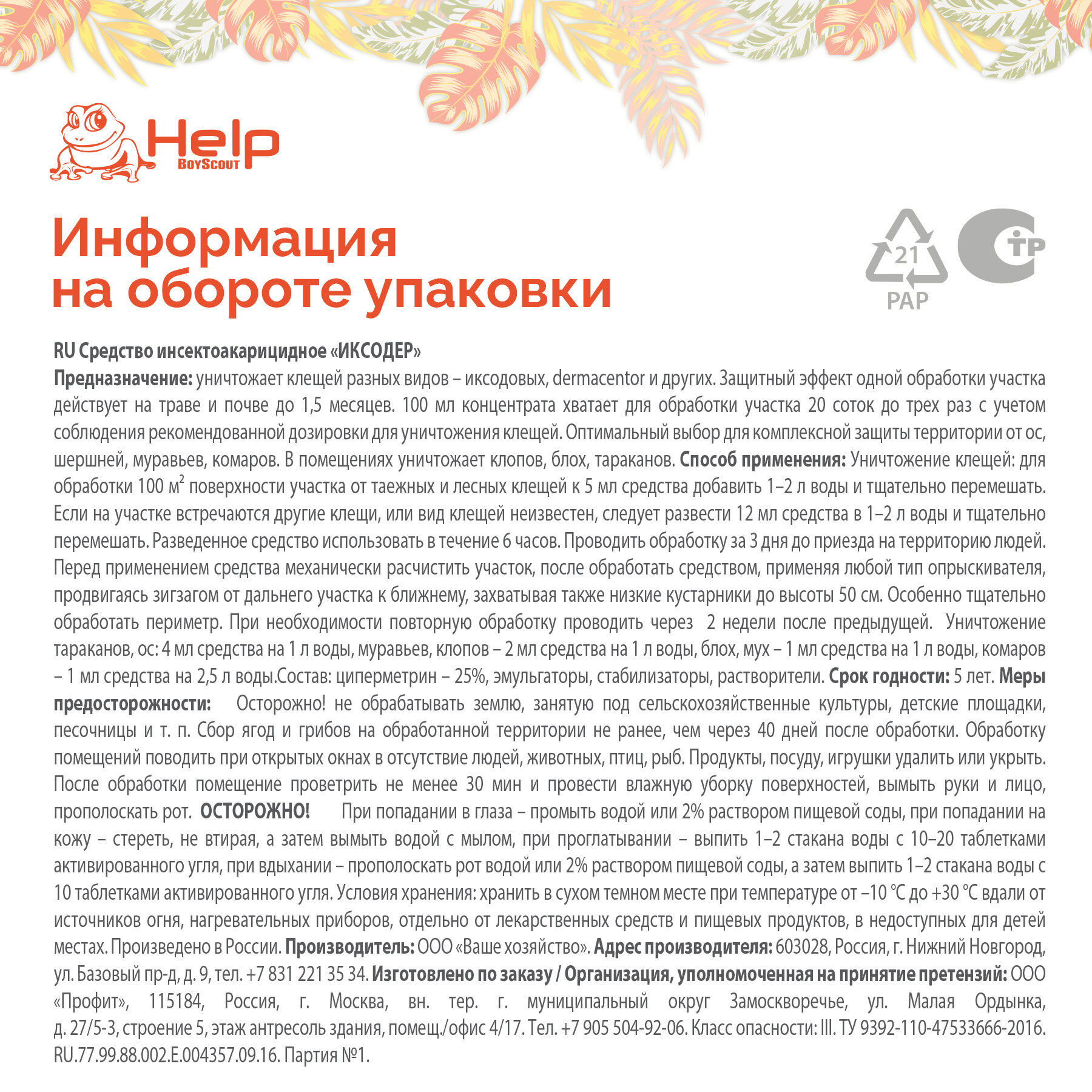 | Состав | циперметрин - 25%, эмульгаторы, стабилизаторы, растворители |