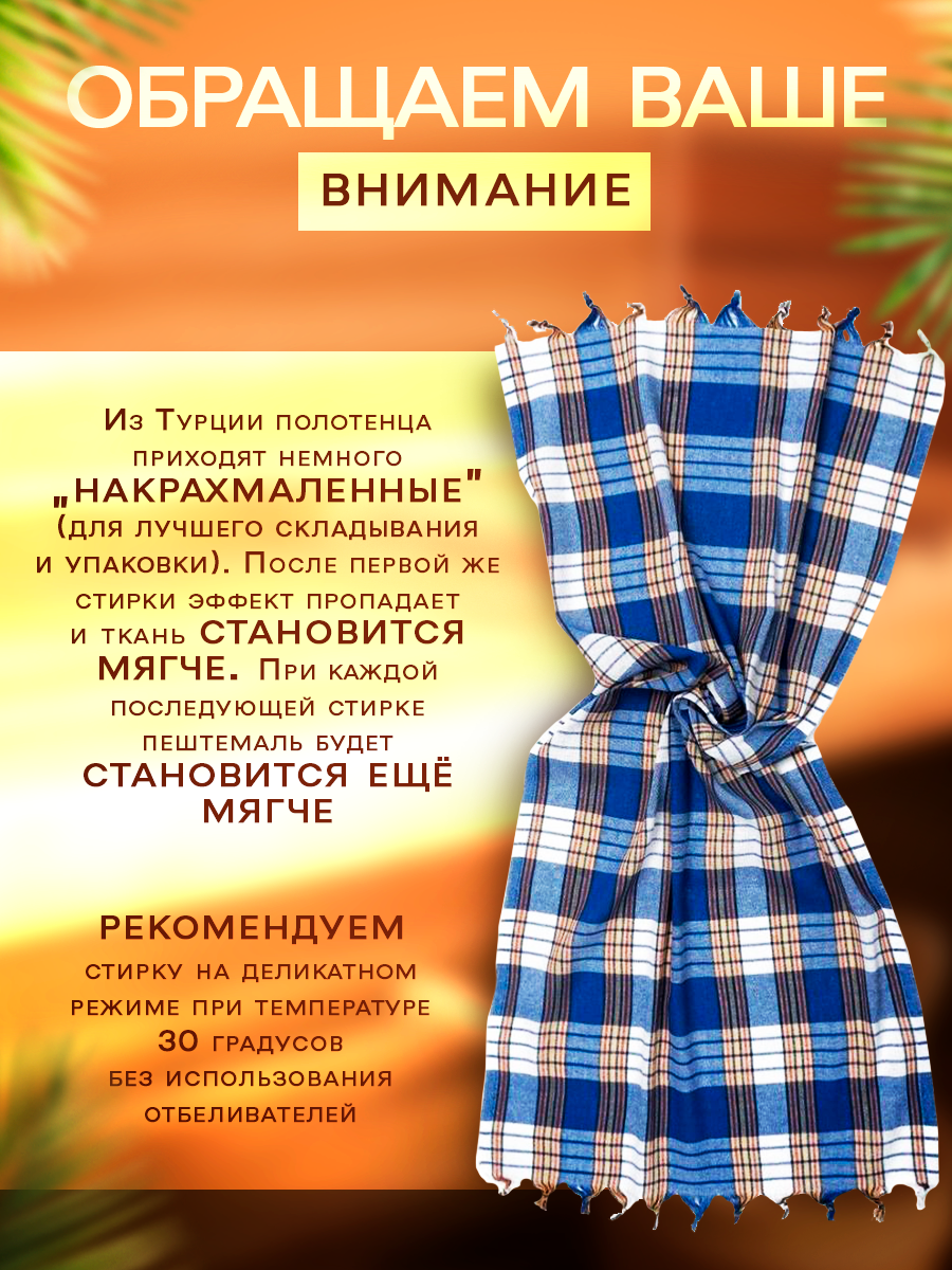Полотенце банное, для хаммам, бани и пляжа/ Пештемаль/Турецкое/ 165х80 см синее интересное: