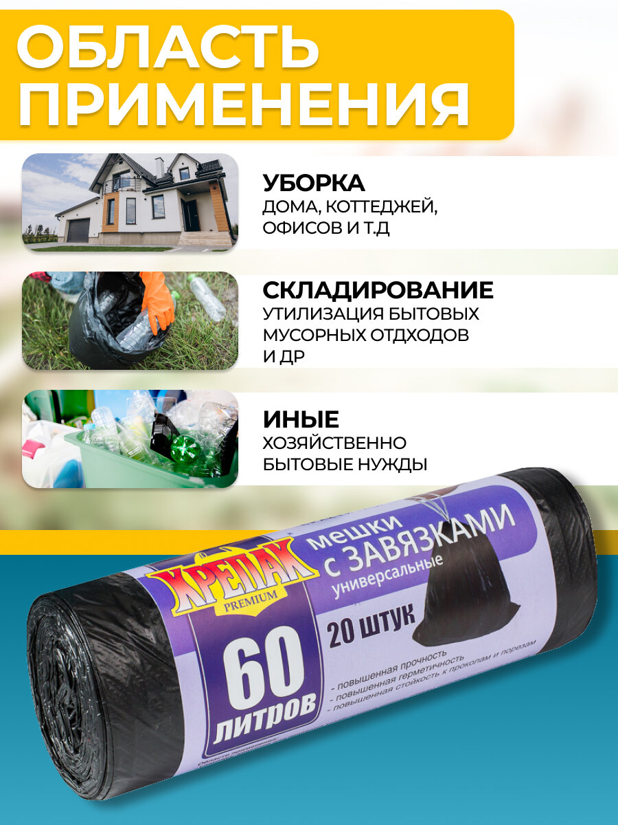 Мешки для мусора с завязками в рулоне Крепак 60 л, 20 шт