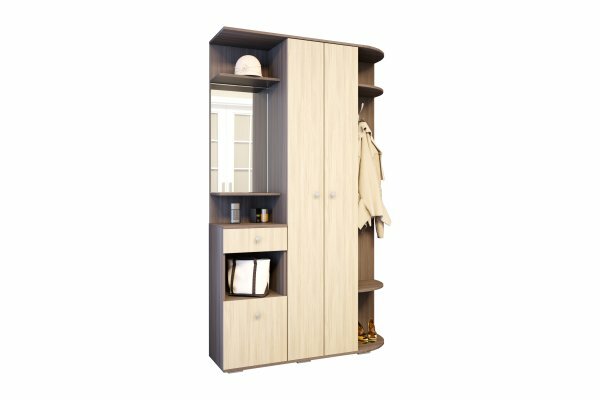 | Состав комплекта | шкаф с выдвижной штангой и с антресольной полкой; выдвижной ящик; вешалка с крючками для одежды; внизу ниша за распашной дверцей; зеркало |