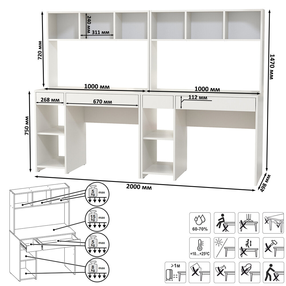 | Дополнительная информация | располагает большими столешницами и вместительной системой хранения для двоих деток, система хранения каждого стола разнообразна - это надстройка с открытыми нишами, открытая тумба со съёмной полкой и два выдвижных ящика стола, защитная ниша надстройки вполне достаточна для установки монитора любого размера, а тумба подойдёт для установки системного блока, стол с множеством открытых ниш, визуально лёгкий, привлекает эргономичностью и стильным дизайном, собираются на любую сторону - при сборке Вы можете расположить тумбу как слева, так и справа |
