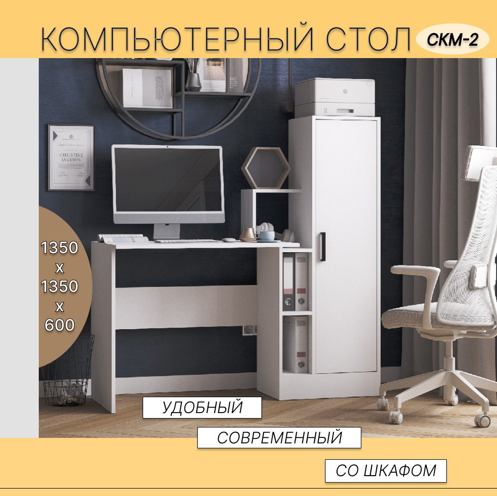 Компьютерный письменный прямой стол, с полками и шкафом для школьника СКМ-1 Белый ( 150*60*135)
