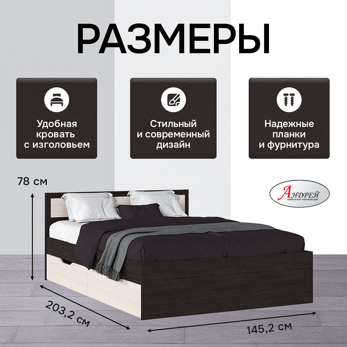 Кровать двуспальная Гармония с выдвижными ящиками для хранения (Виктория) 140х200 см, Дуб белфорт/Венге