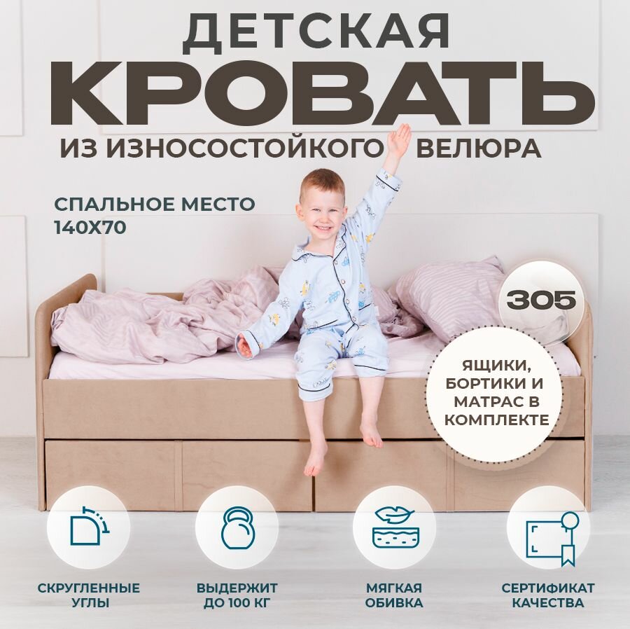 Купить Кровать детская подростковая односпальная 140х70 бежевый с двумя ящиками, бортиком и матрасом в комплекте
