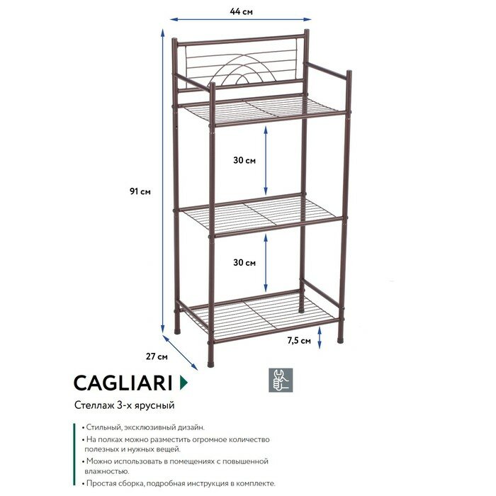 | Дополнительная информация | Стильный, эксклюзивный дизайн. На полках можно разместить огромное количество полезных и нужных вещей. Можно использовать в помещениях с повышенной влажностью. Простая сборка, подробная инструкция прилагается |