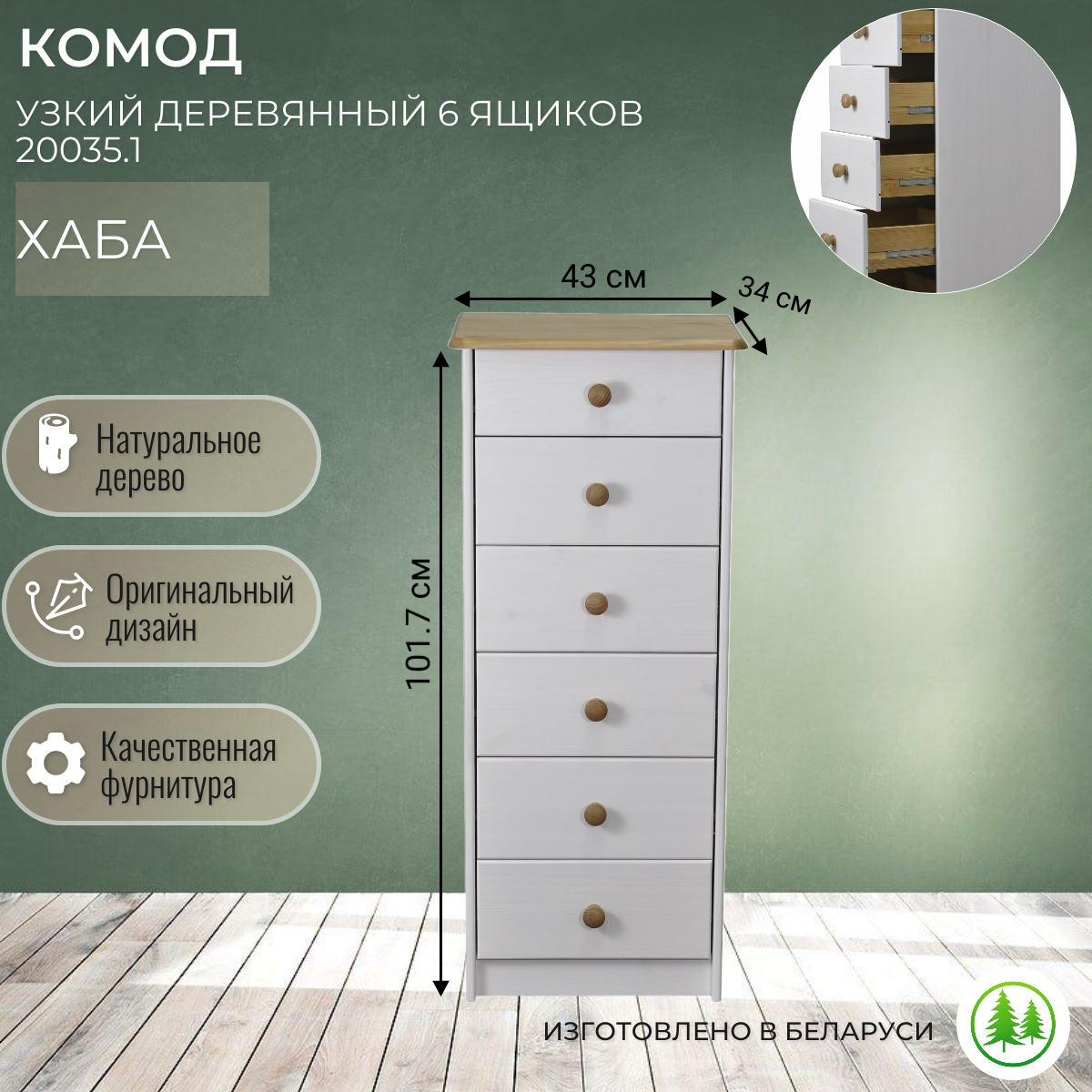 Комод белый с 6 ящиками Хаба из массива сосны, высокий деревянный комод в спальню и детскую, белый/антик интересное: