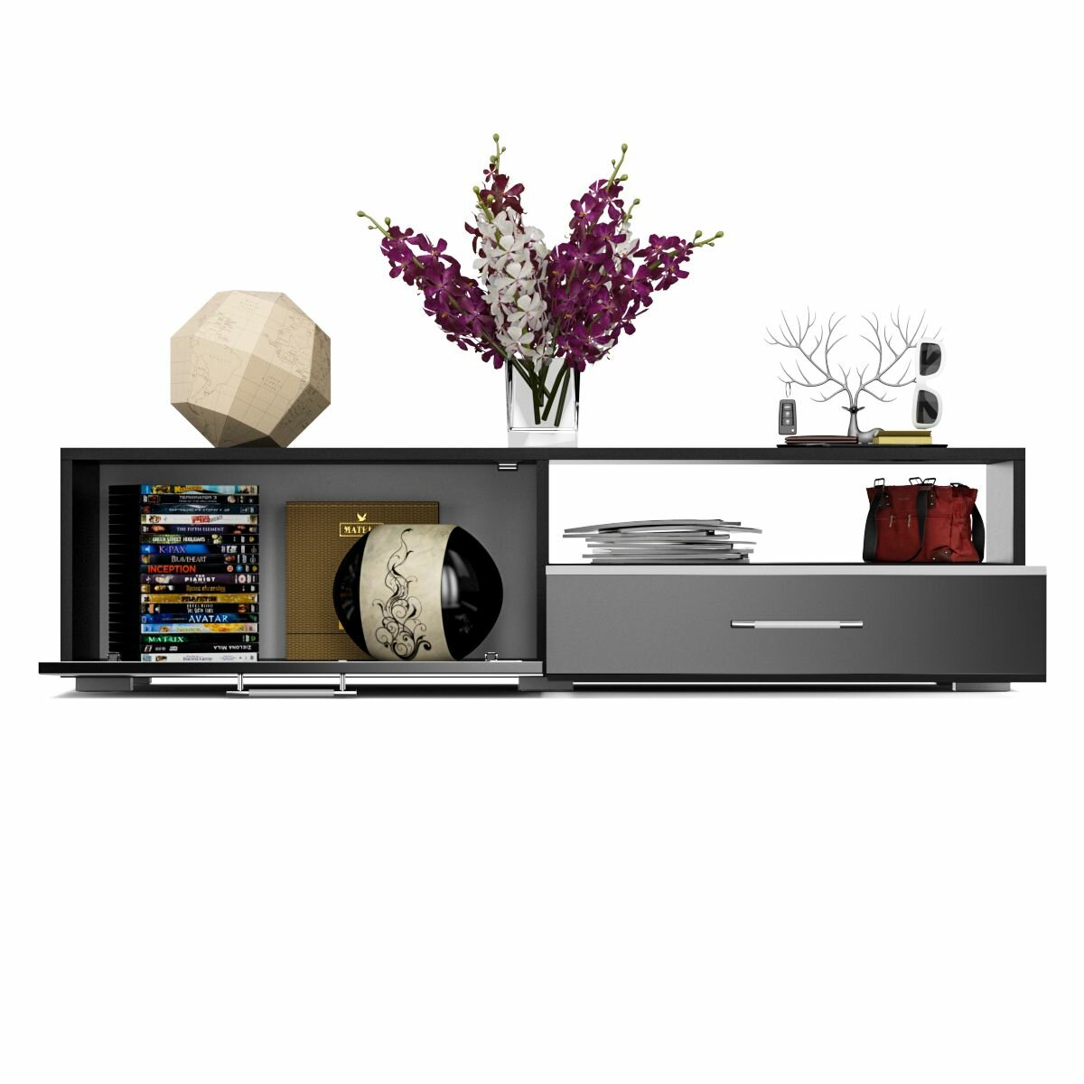 | Комплектация | 2 отделения, слева закрытая откидной дверкой ниша, справа - открытая ниша и выдвижной ящик, торцевая фрезеровка, ручки-рейлинги с хромированно-матовым покрытием, плоские прямоугольные ножки |