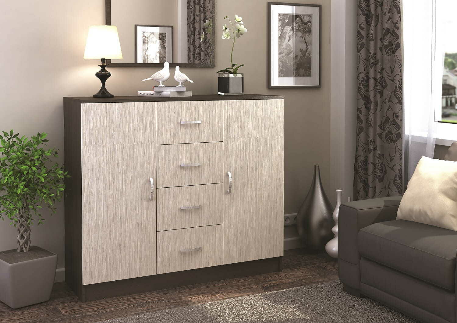 Комод 4 ящика и 2 створки КМ 555М «Бася» (Шимо тёмный/Шимо светлый) CM