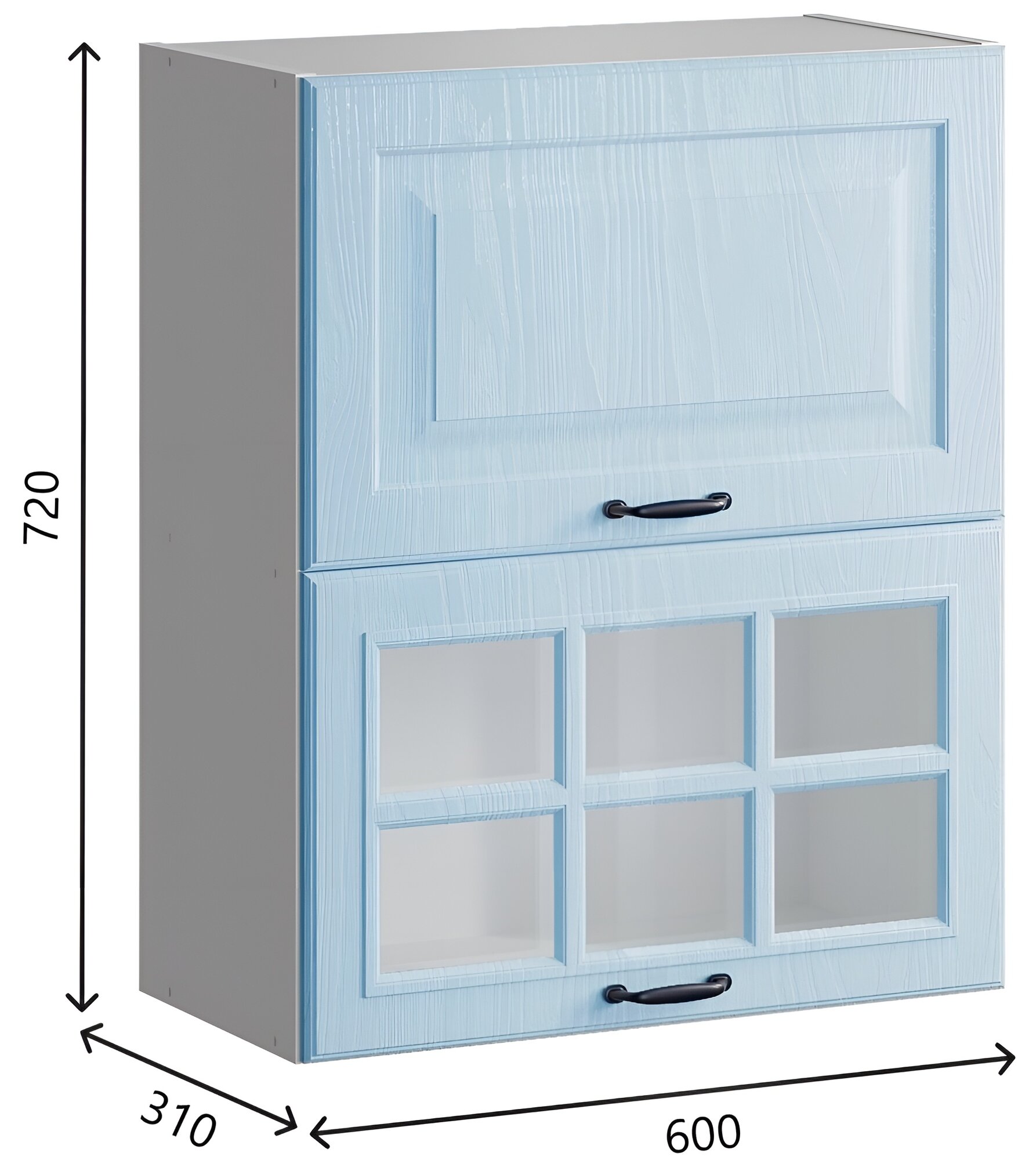СохранитьШкаф кухонный навесной двойной 60 см, с газлифтами, МДФ Лазурное дерево + стекло интересное:
