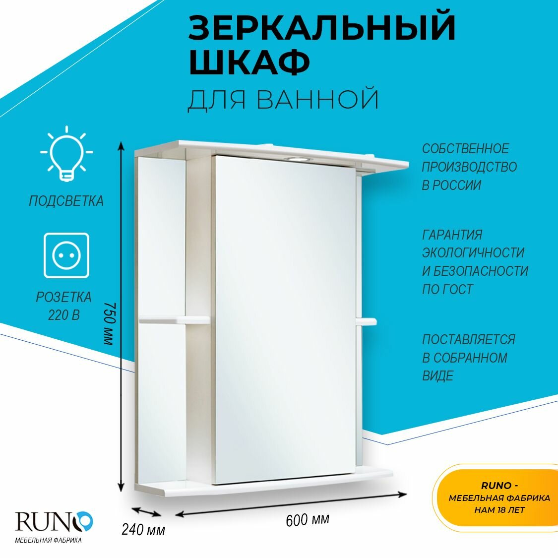 Шкаф в ванную с зеркалом Runo Линда 60, с подсветкой, правый