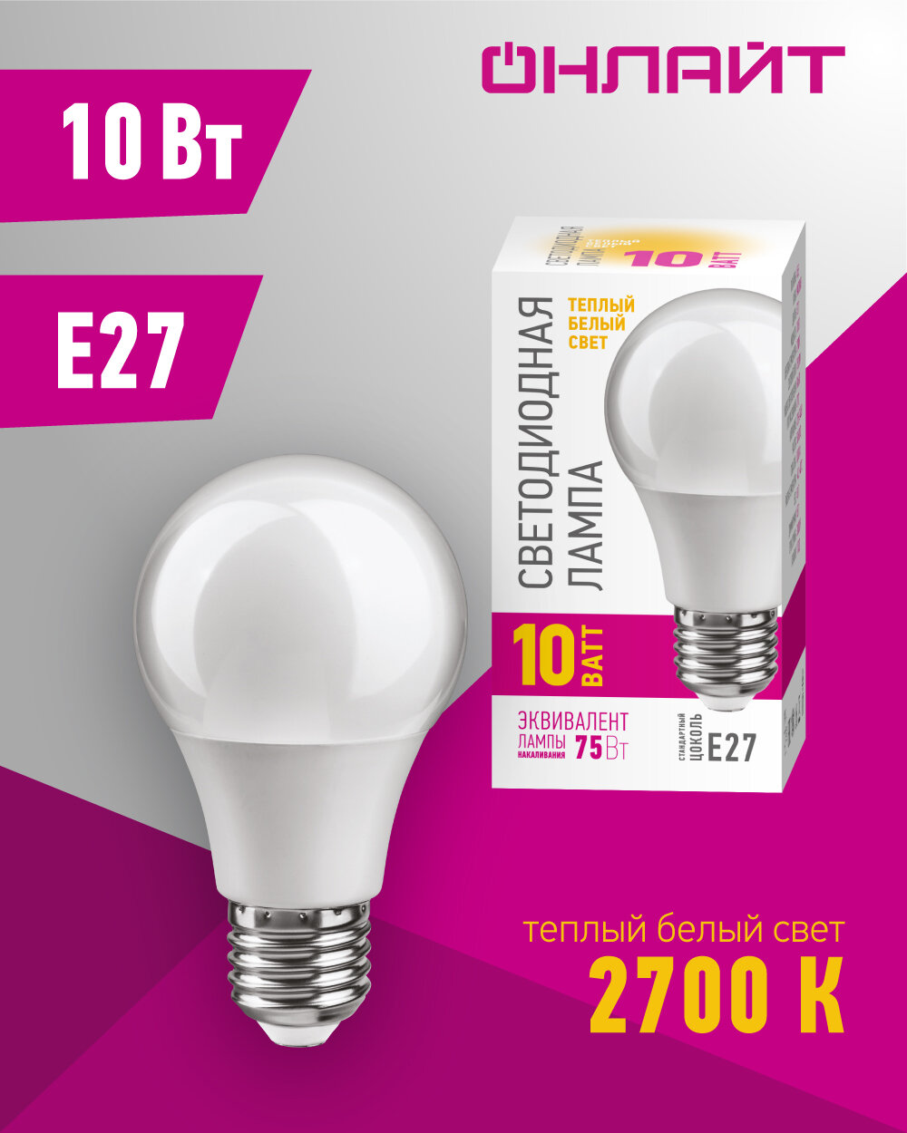 (10 шт.) Светодиодная лампочка онлайт промо ЛОН А55 E27 10W (750lm) 2700K 2K 98x55 OLL-A55-10-230-2.7K-E27-PROMO, 82910 . Цоколь E27